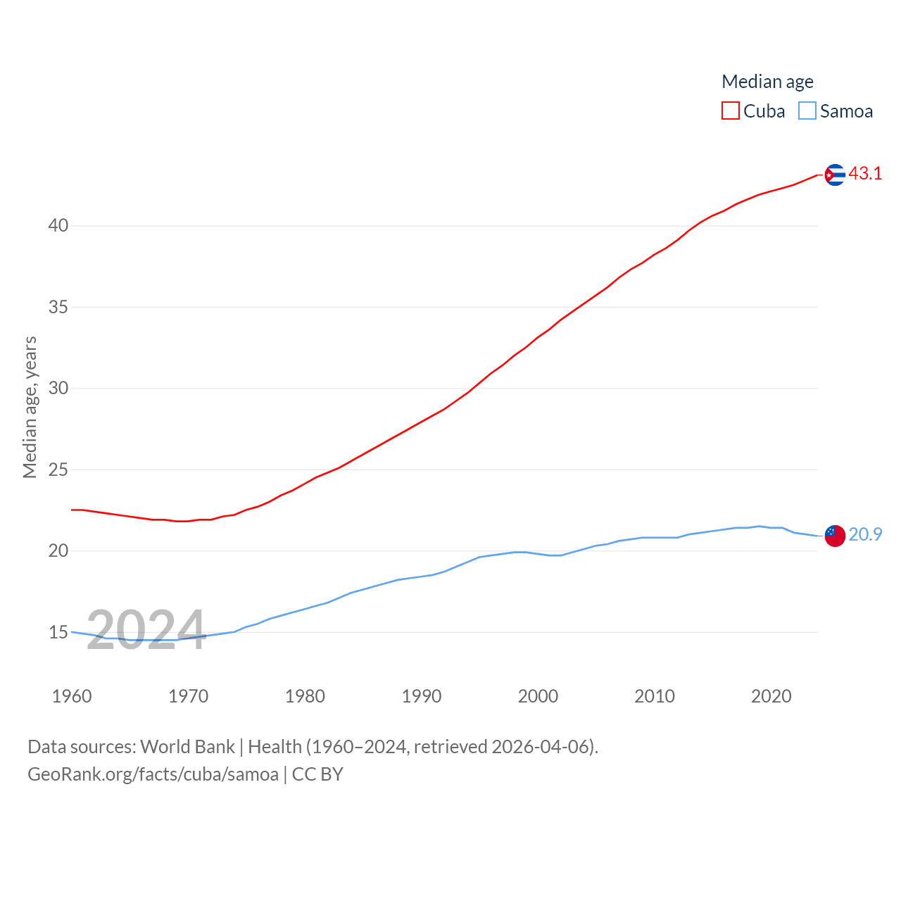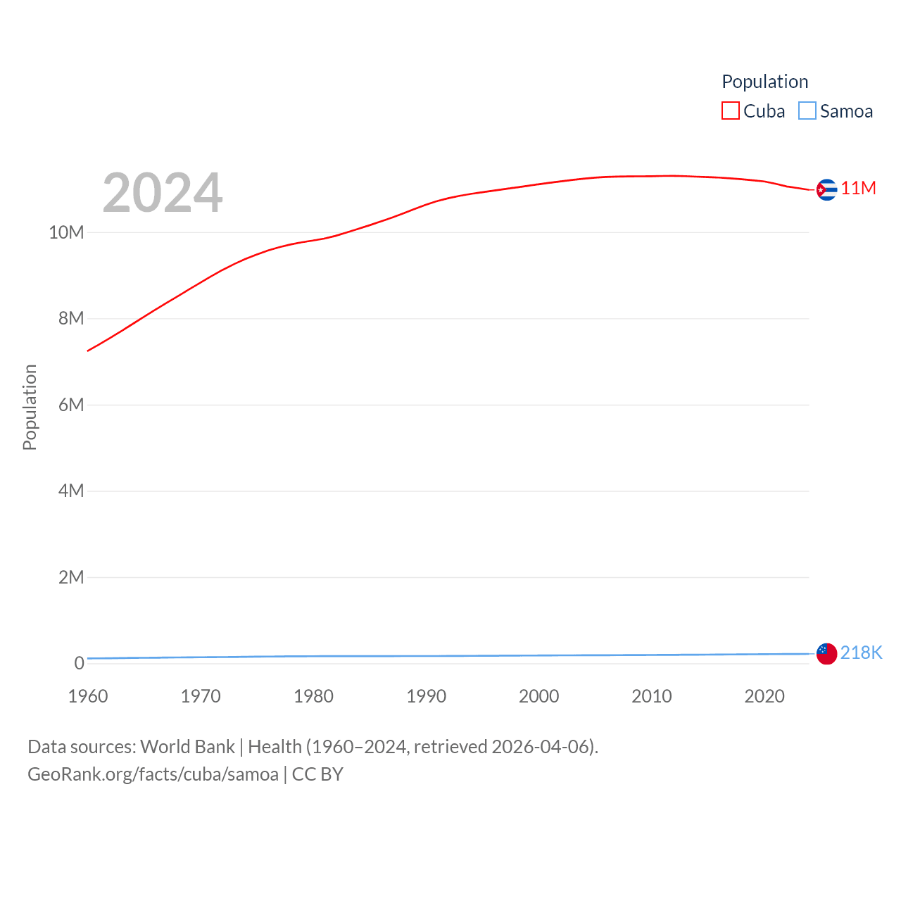 Cuba has a population of 11M (ranked 87/197), compared with 218K in Samoa (ranked 177/197). Cuba's land area is 40,077 sq mi versus 1,073 sq mi for Samoa (ranked 103rd vs. 168th).