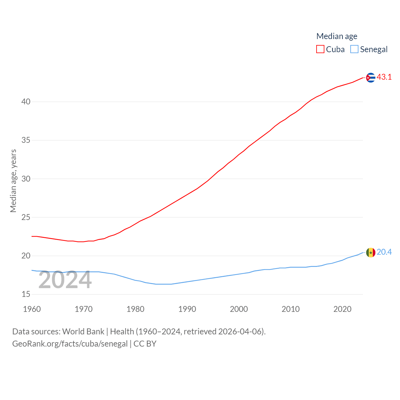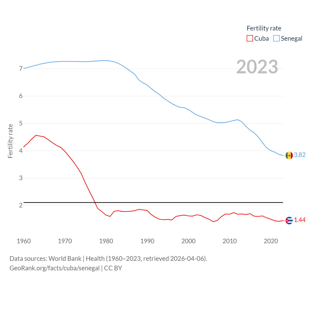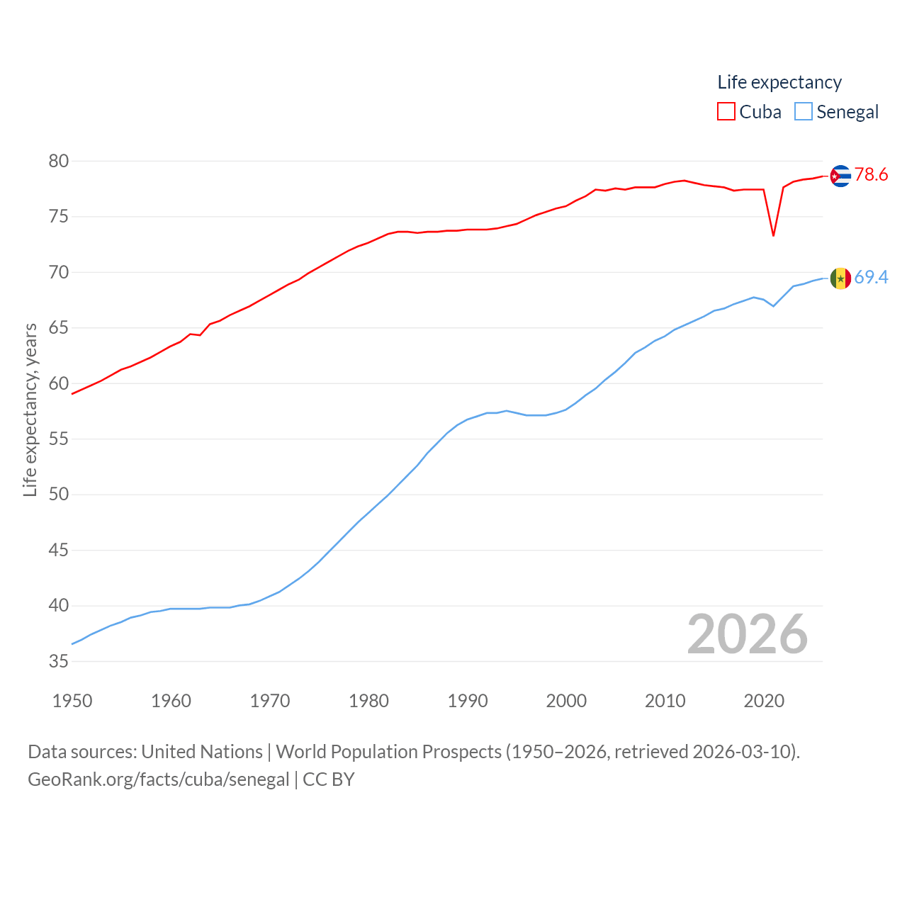 Cuba has a population of 11M (ranked 87/197), compared with 18.5M in Senegal (ranked 69/197). Cuba's land area is 40,077 sq mi versus 74,336 sq mi for Senegal (ranked 103rd vs. 85th).