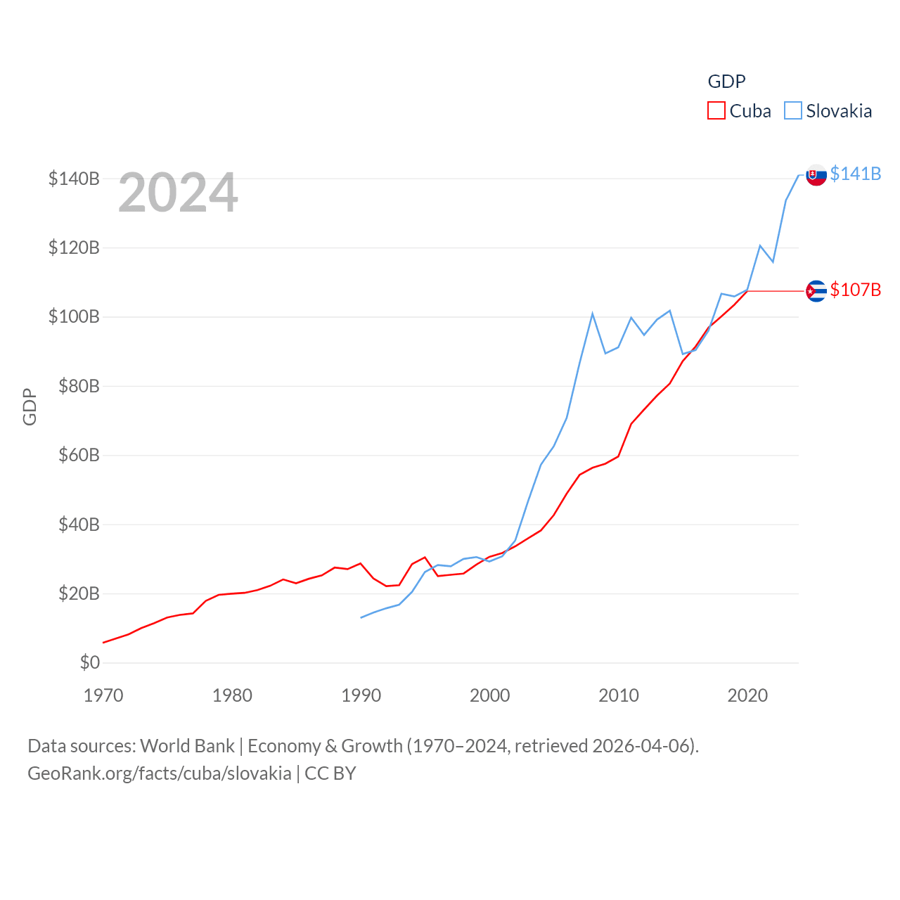 By GDP, Cuba ranks 69/197 ($107B) and Slovakia ranks 61/197 ($141B). By GDP per capita, Cuba ranks 86/197 ($9,605), while Slovakia ranks 47/197 ($25,993).