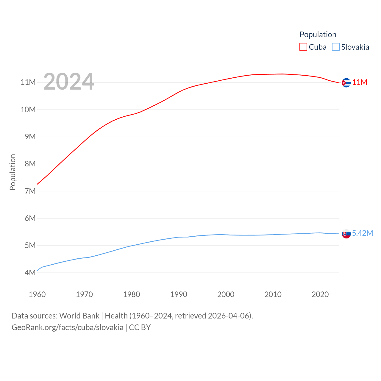 Cuba has a population of 11M (ranked 87/197), compared with 5.42M in Slovakia (ranked 119/197). Cuba's land area is 40,077 sq mi versus 18,564 sq mi for Slovakia (ranked 103rd vs. 128th).