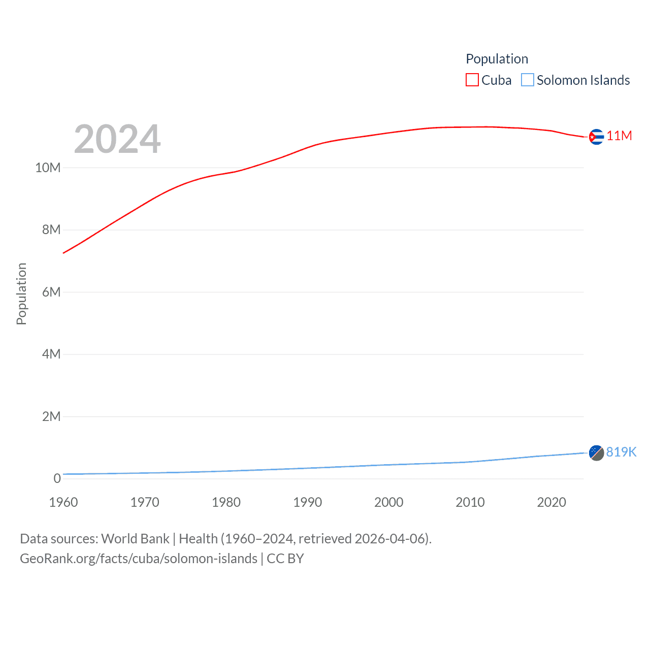 Cuba has a population of 11M (ranked 87/197), compared with 819K in The Solomon Islands (ranked 162/197). Cuba's land area is 40,077 sq mi versus 10,807 sq mi for The Solomon Islands (ranked 103rd vs. 141st).