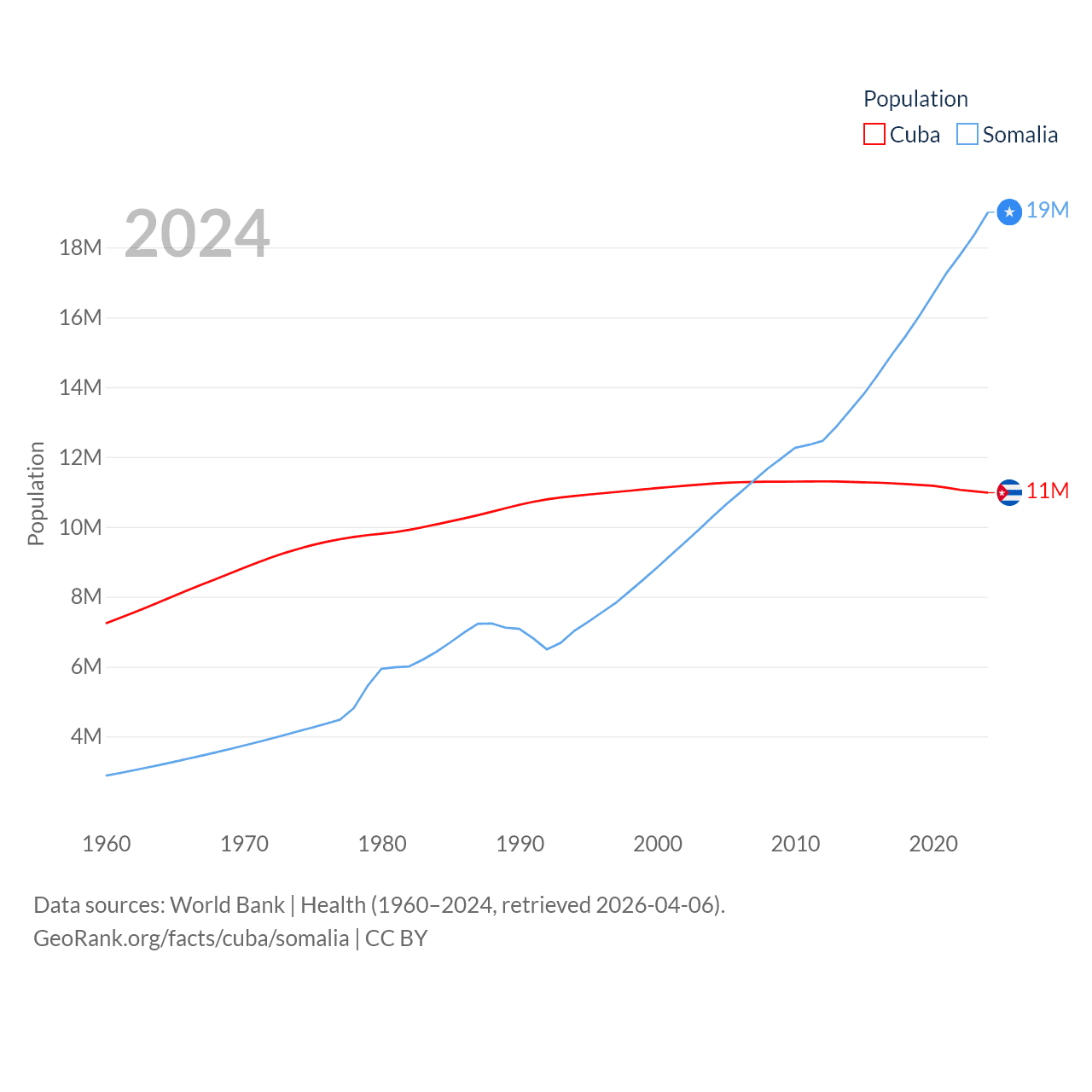 Cuba has a population of 11M (ranked 87/197), compared with 19M in Somalia (ranked 68/197). Cuba's land area is 40,077 sq mi versus 242,217 sq mi for Somalia (ranked 103rd vs. 42nd).
