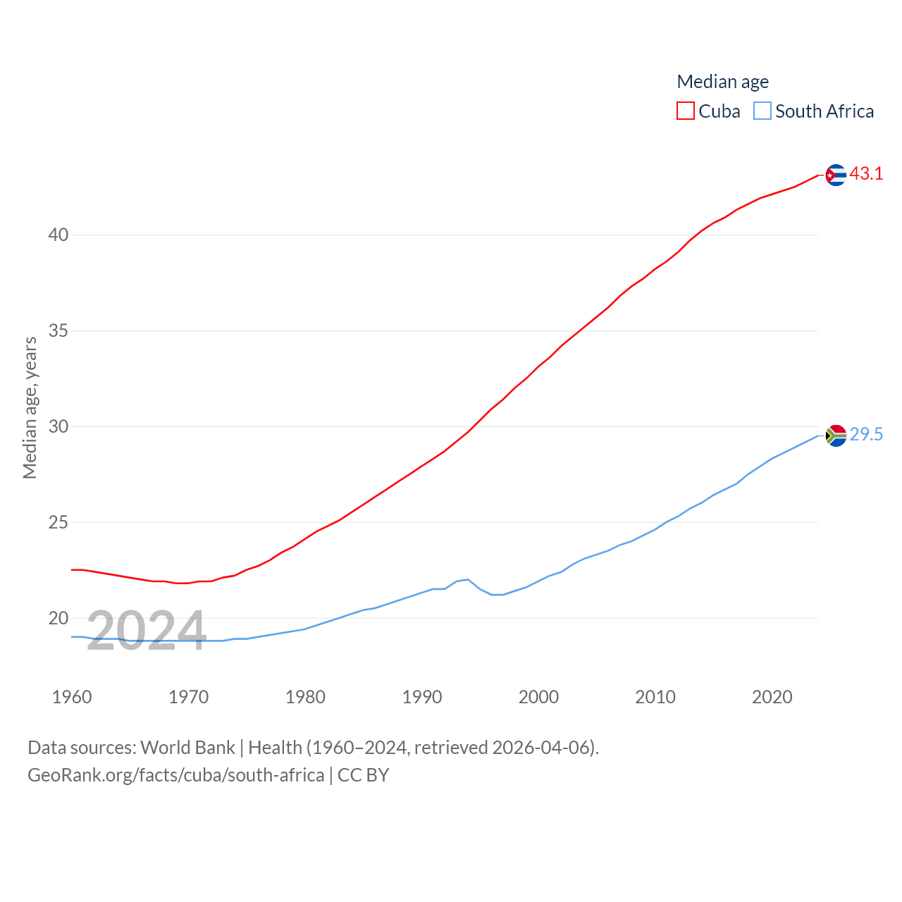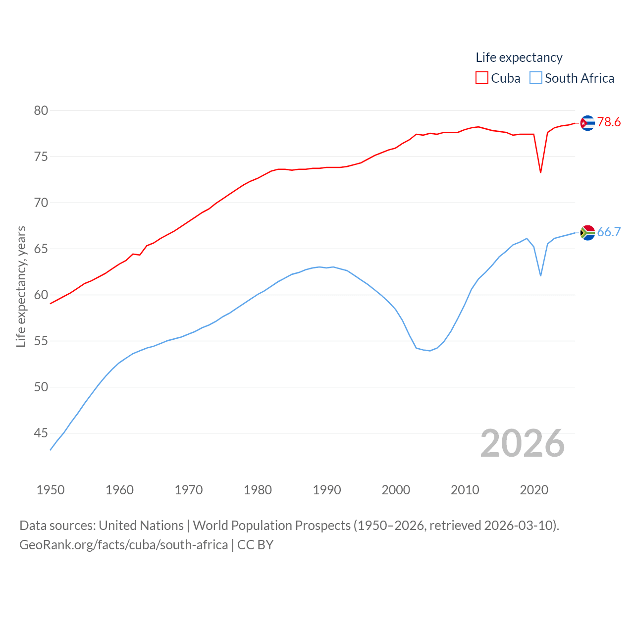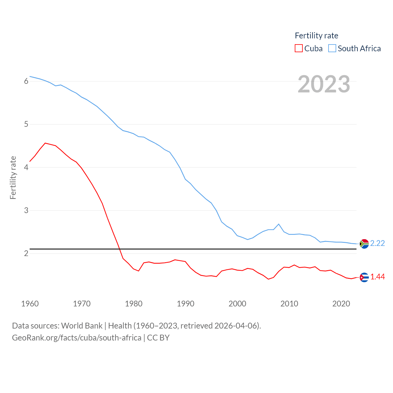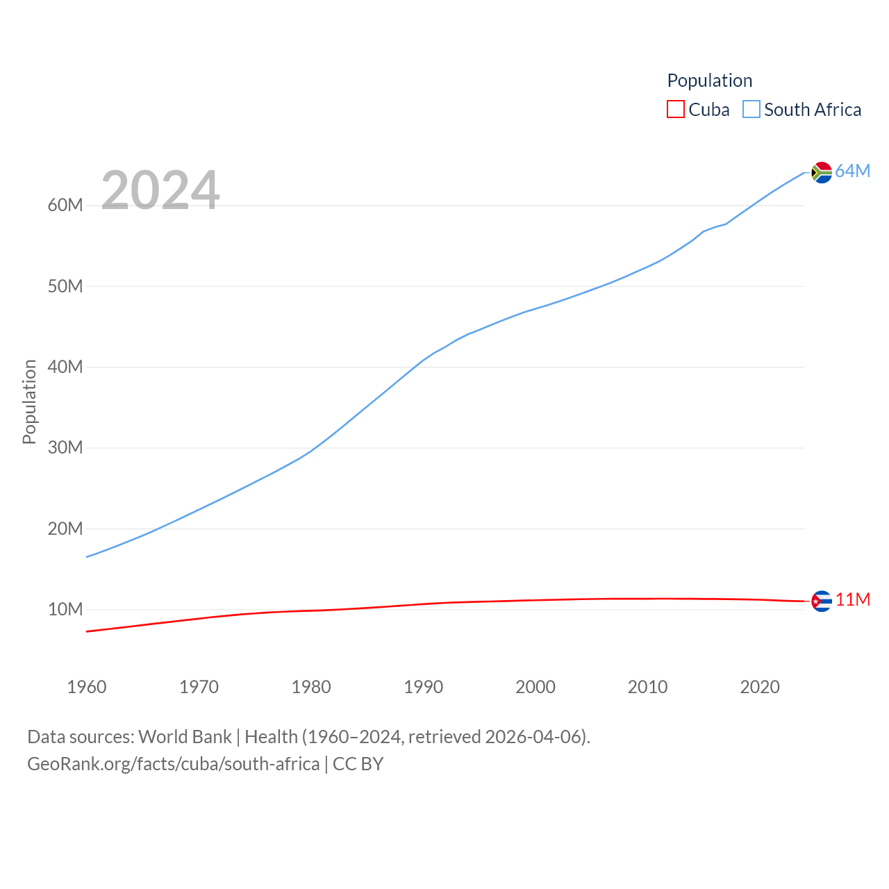 Cuba has a population of 11M (ranked 87/197), compared with 64M in South Africa (ranked 24/197). Cuba's land area is 40,077 sq mi versus 468,377 sq mi for South Africa (ranked 103rd vs. 24th).