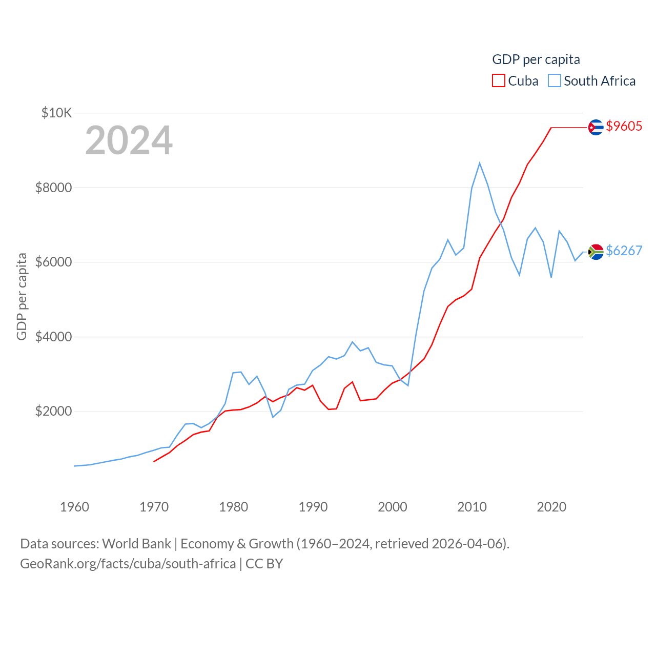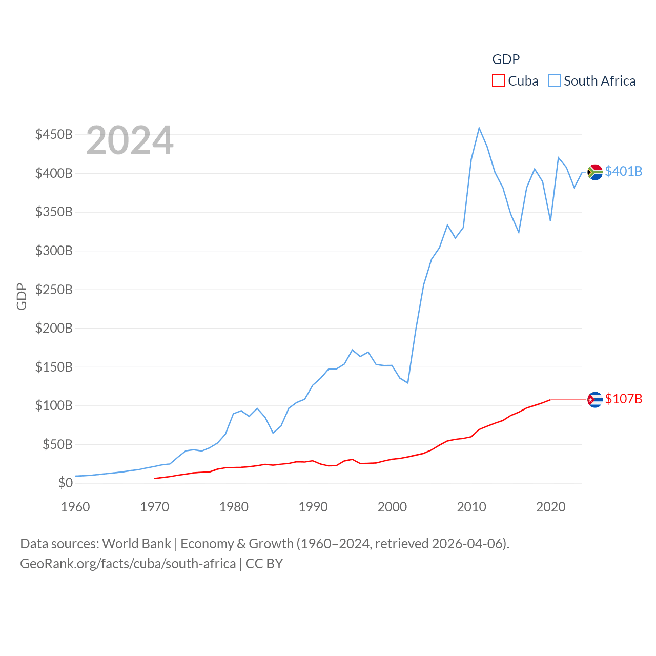 By GDP, Cuba ranks 69/197 ($107B) and South Africa ranks 40/197 ($401B). By GDP per capita, Cuba ranks 86/197 ($9,605), while South Africa ranks 111/197 ($6,267).