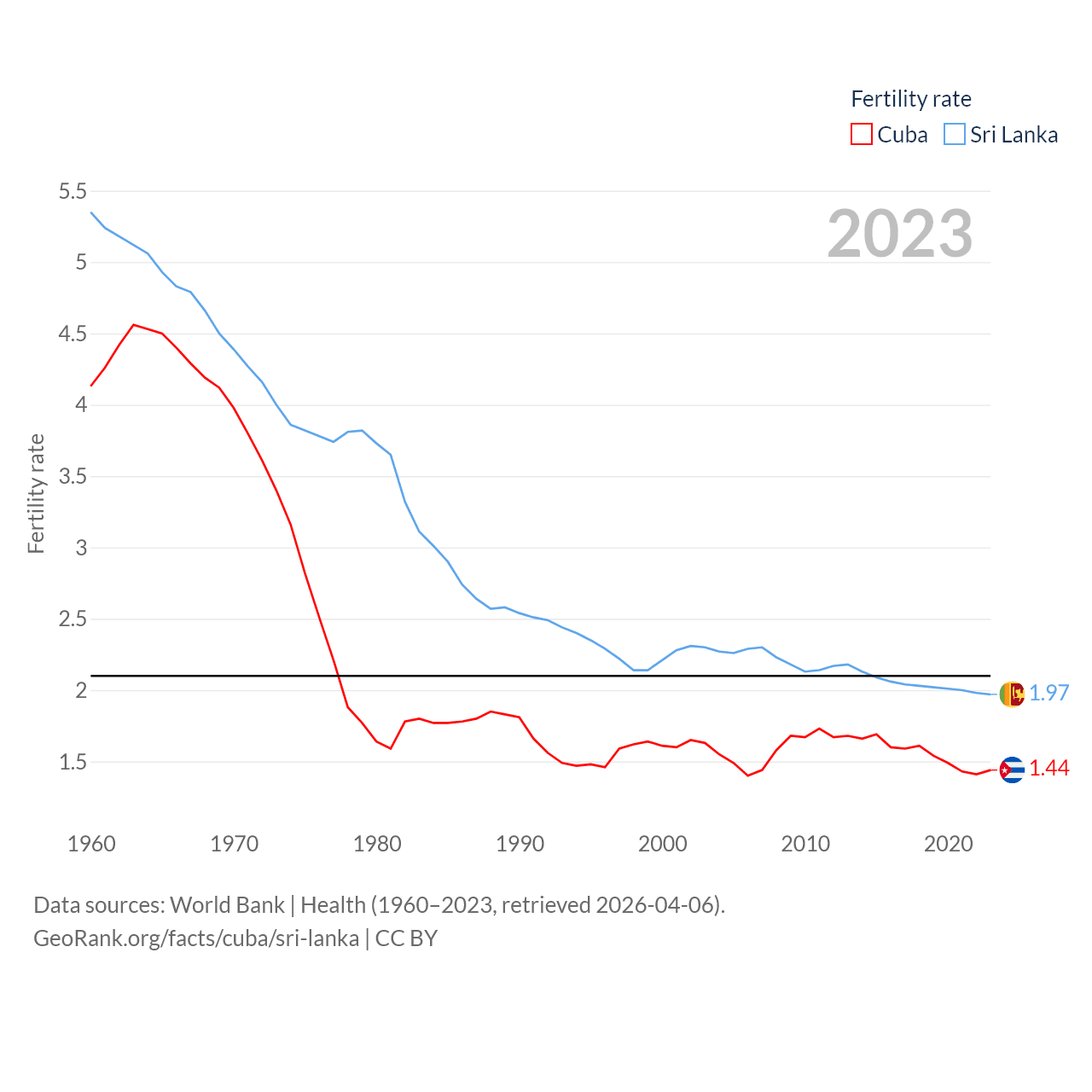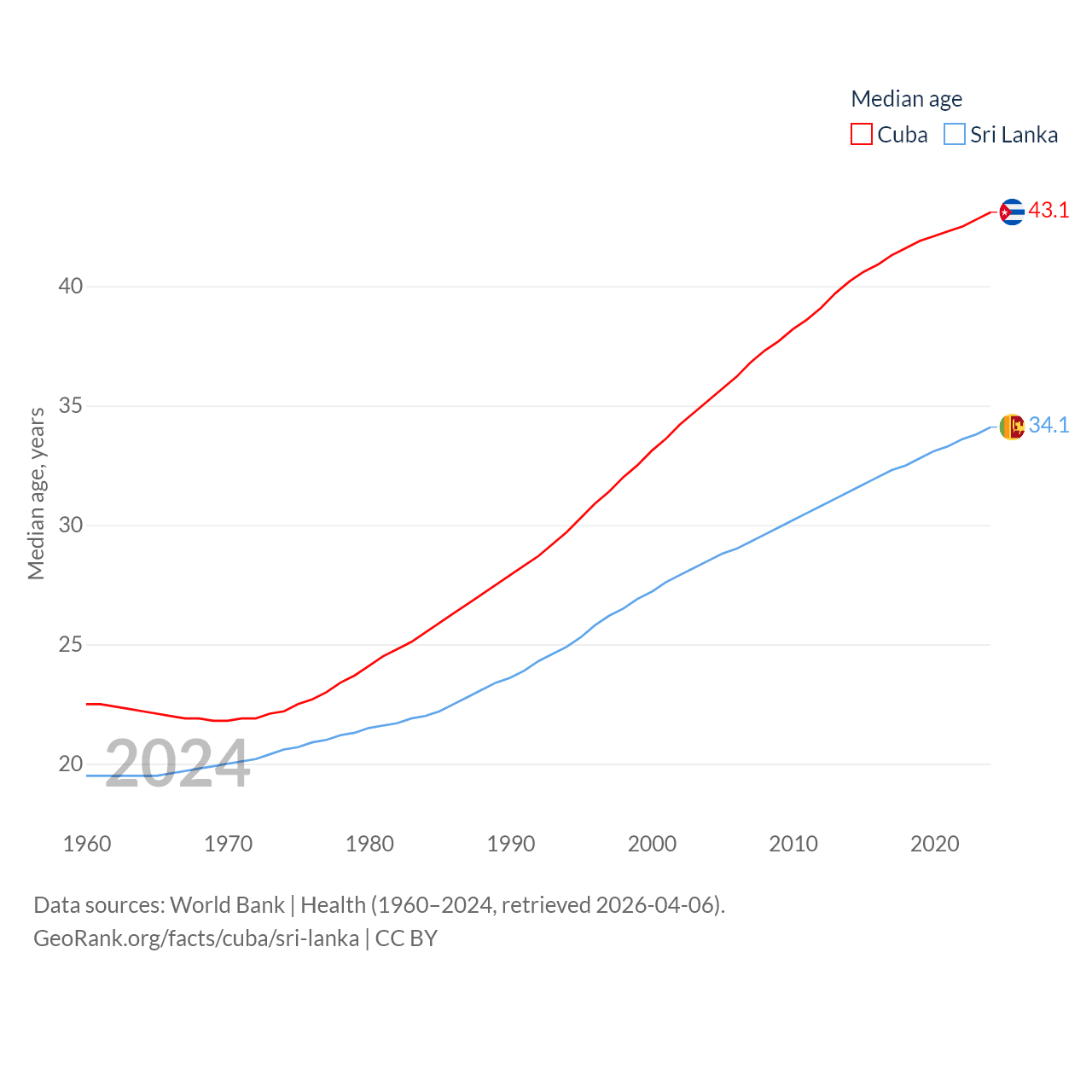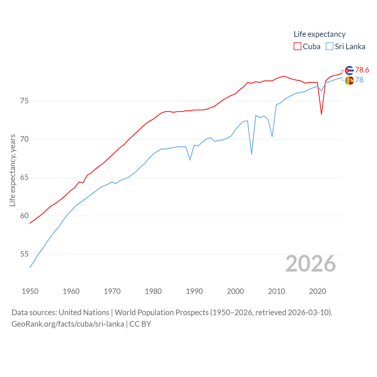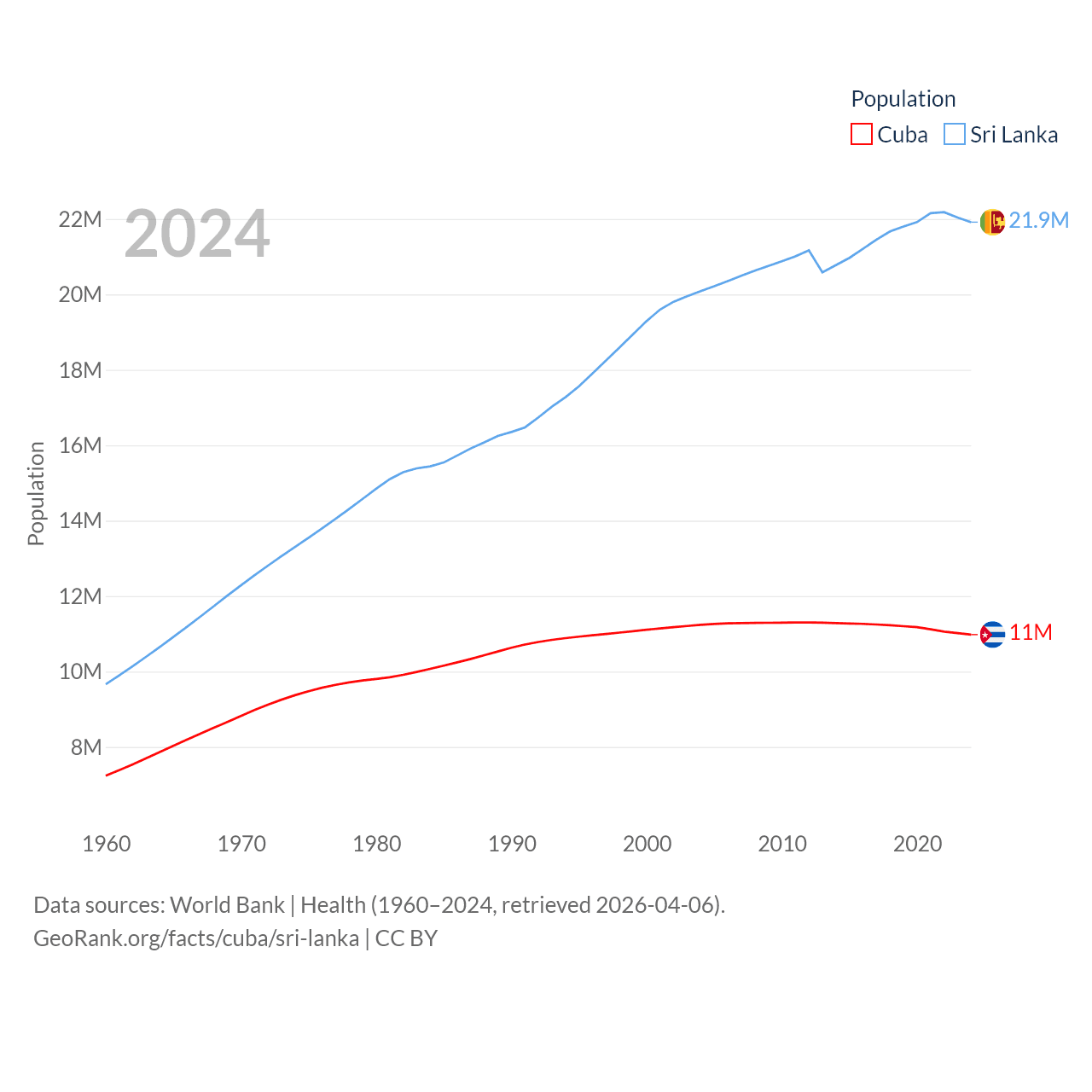 Cuba has a population of 11M (ranked 87/197), compared with 21.9M in Sri Lanka (ranked 61/197). Cuba's land area is 40,077 sq mi versus 23,884 sq mi for Sri Lanka (ranked 103rd vs. 122nd).