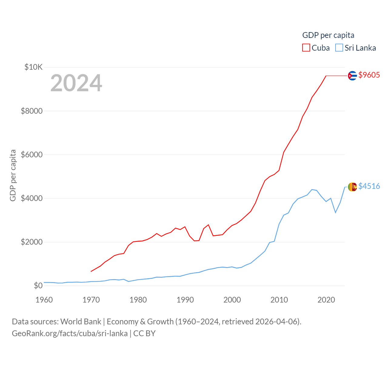 By GDP, Cuba ranks 69/197 ($107B) and Sri Lanka ranks 72/197 ($99B). By GDP per capita, Cuba ranks 86/197 ($9,605), while Sri Lanka ranks 124/197 ($4,516).