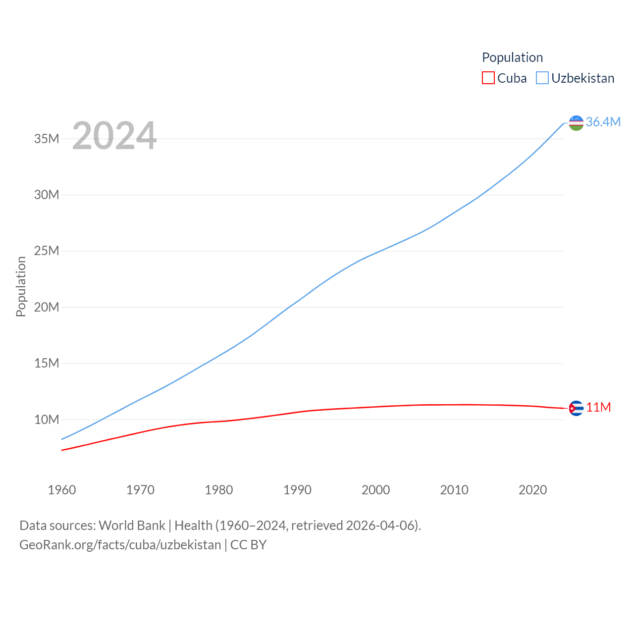Cuba has a population of 11M (ranked 87/197), compared with 36.4M in Uzbekistan (ranked 43/197). Cuba's land area is 40,077 sq mi versus 170,136 sq mi for Uzbekistan (ranked 103rd vs. 56th).
