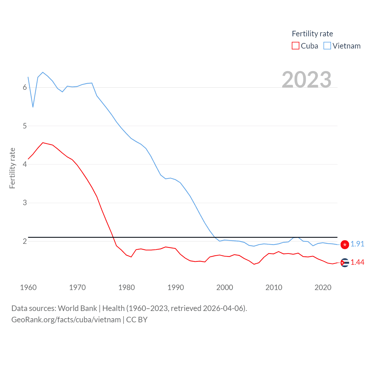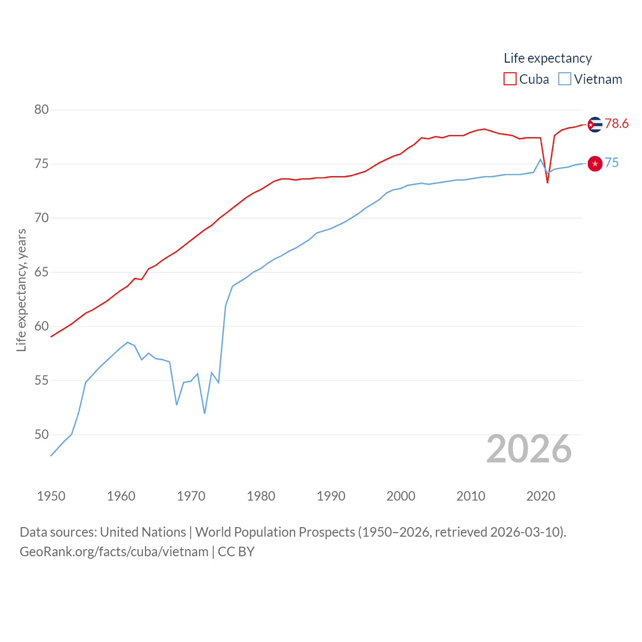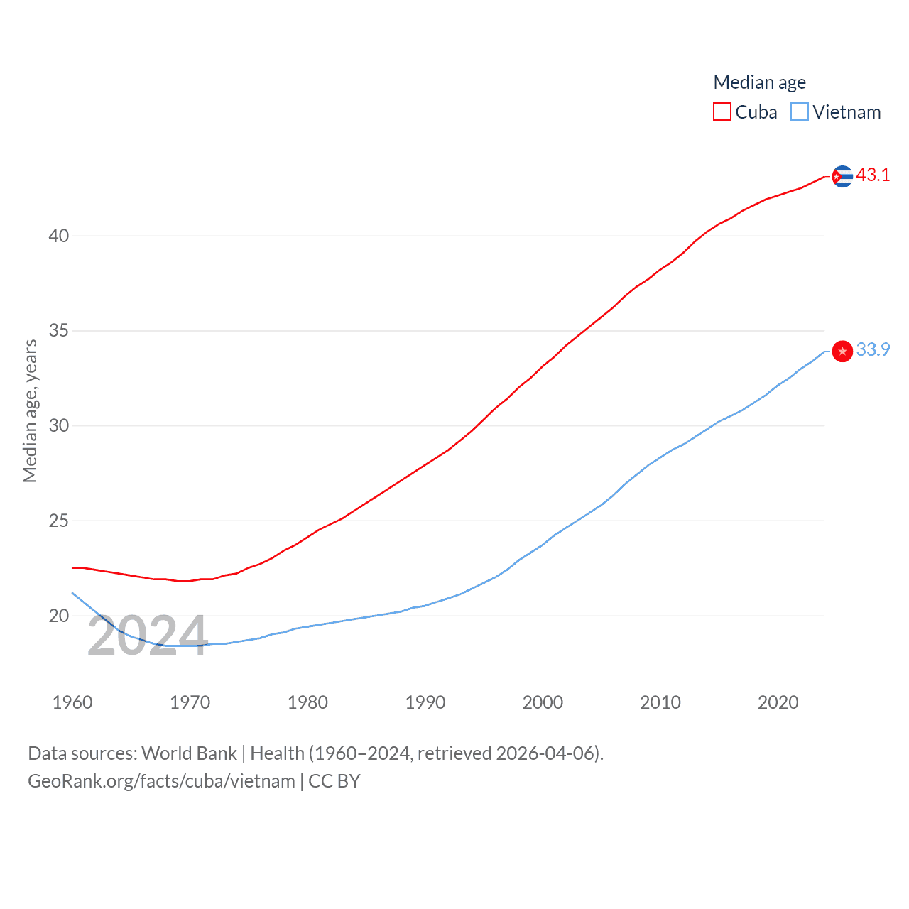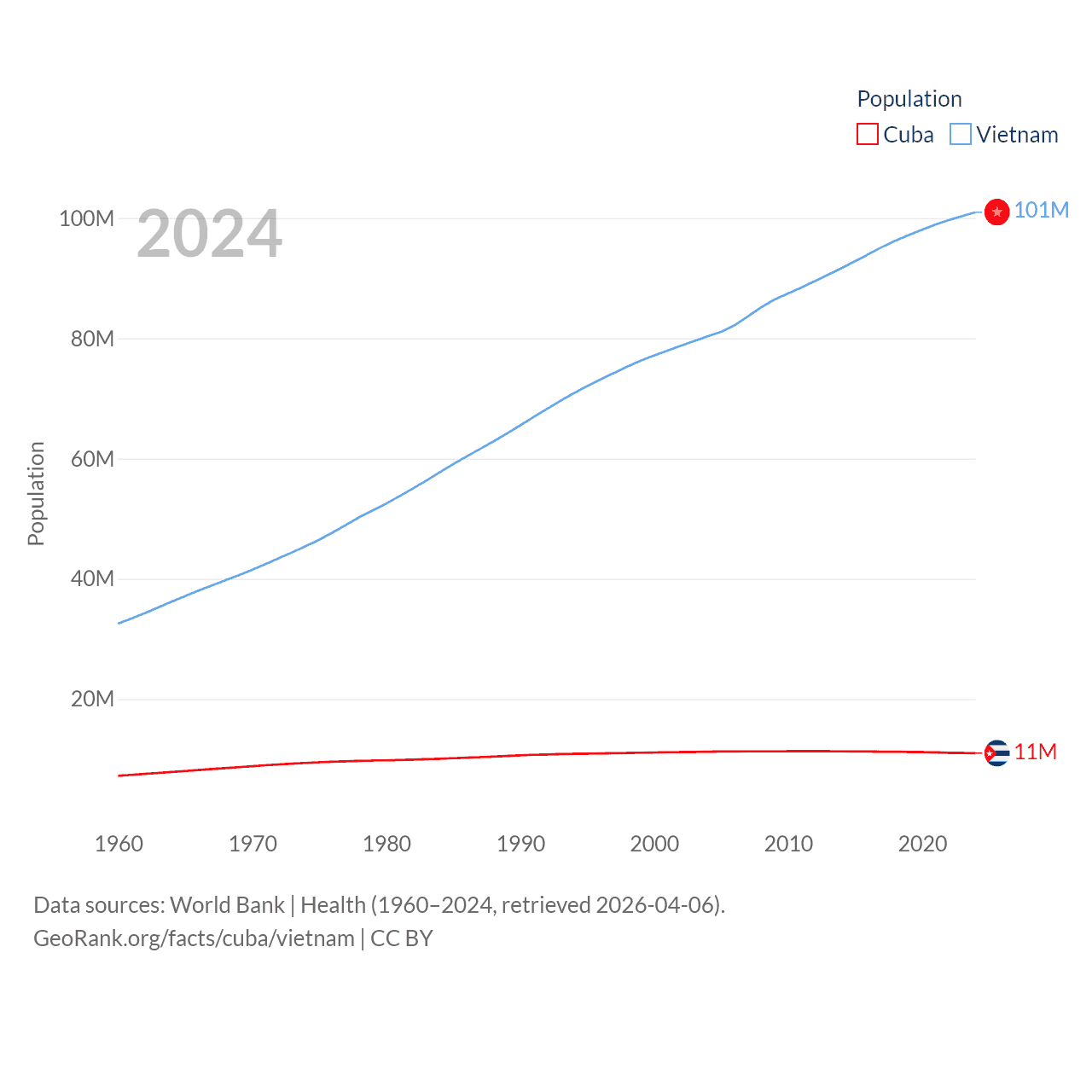 Cuba has a population of 11M (ranked 87/197), compared with 101M in Vietnam (ranked 16/197). Cuba's land area is 40,077 sq mi versus 121,016 sq mi for Vietnam (ranked 103rd vs. 67th).