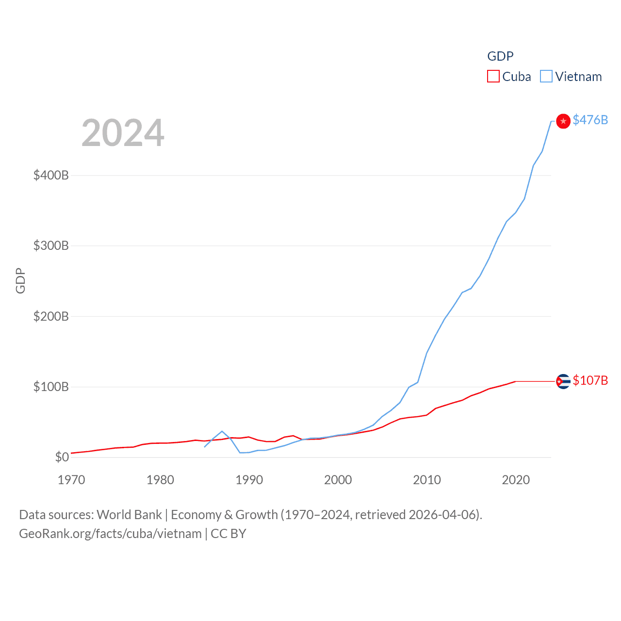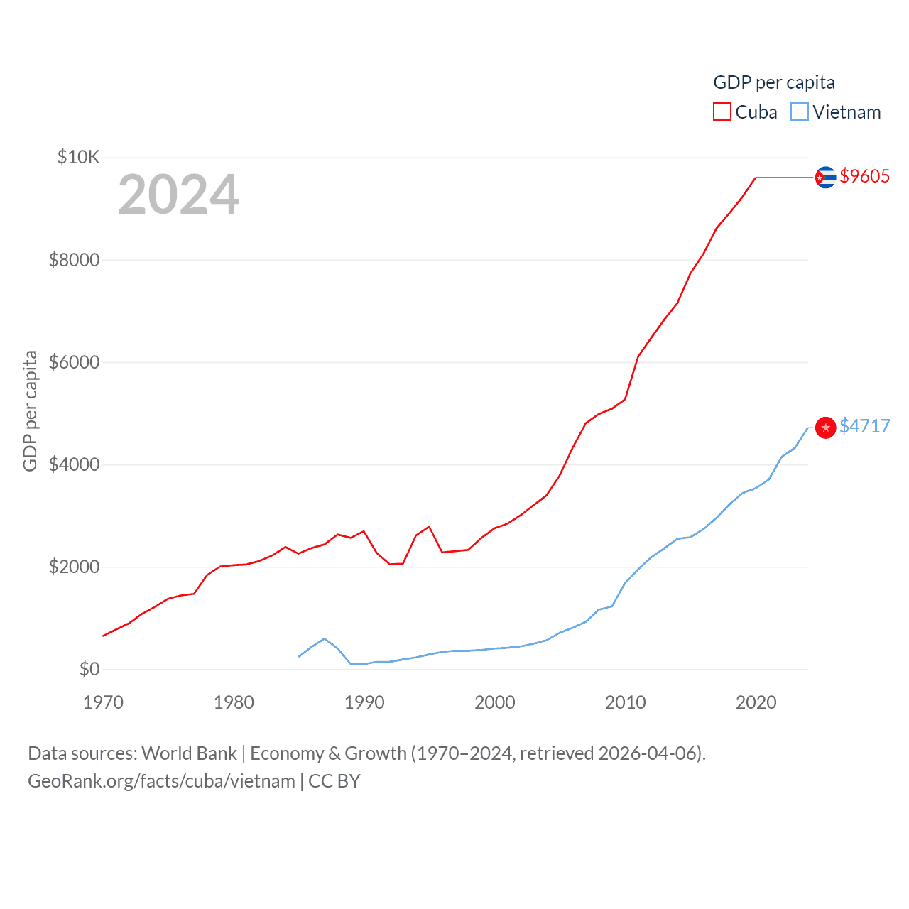 By GDP, Cuba ranks 69/197 ($107B) and Vietnam ranks 33/197 ($476B). By GDP per capita, Cuba ranks 86/197 ($9,605), while Vietnam ranks 122/197 ($4,717).