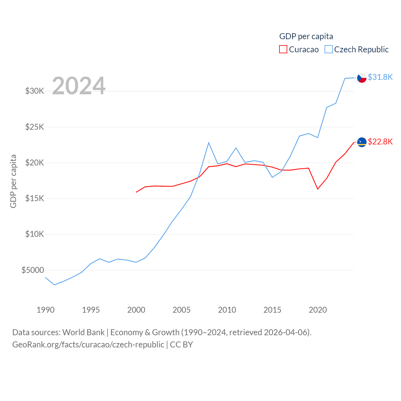 By GDP, Curacao ranks 167/197 ($3.56B) and The Czech Republic ranks 44/197 ($347B). By GDP per capita, Curacao ranks 56/197 ($22,833), while The Czech Republic ranks 39/197 ($31,823).
