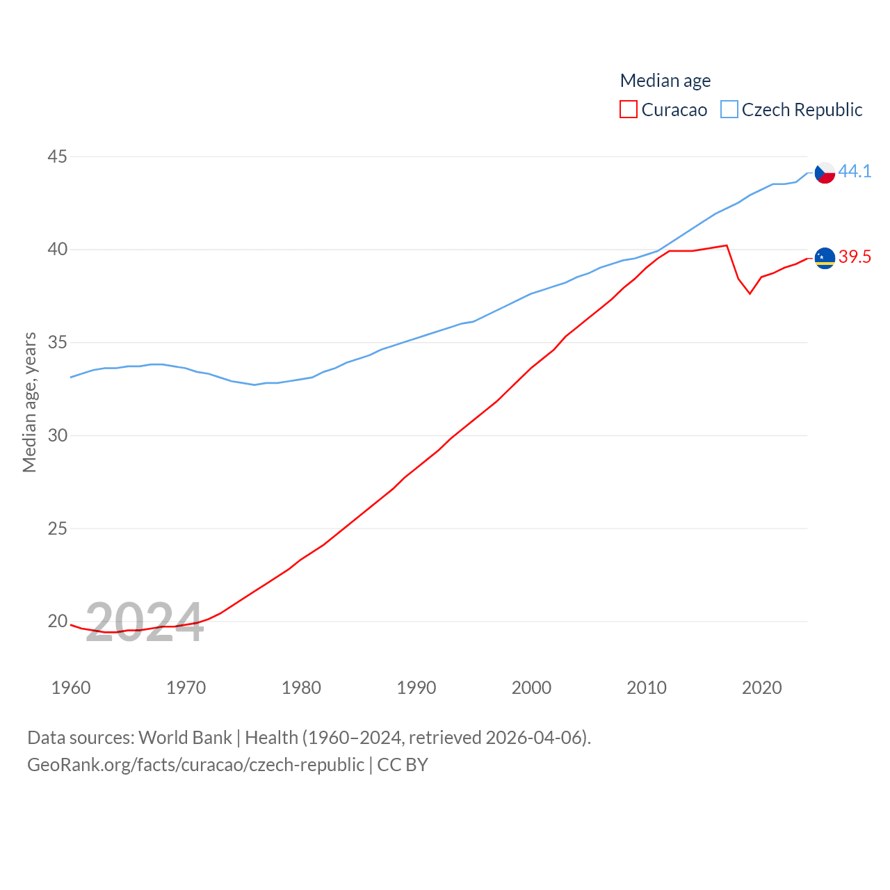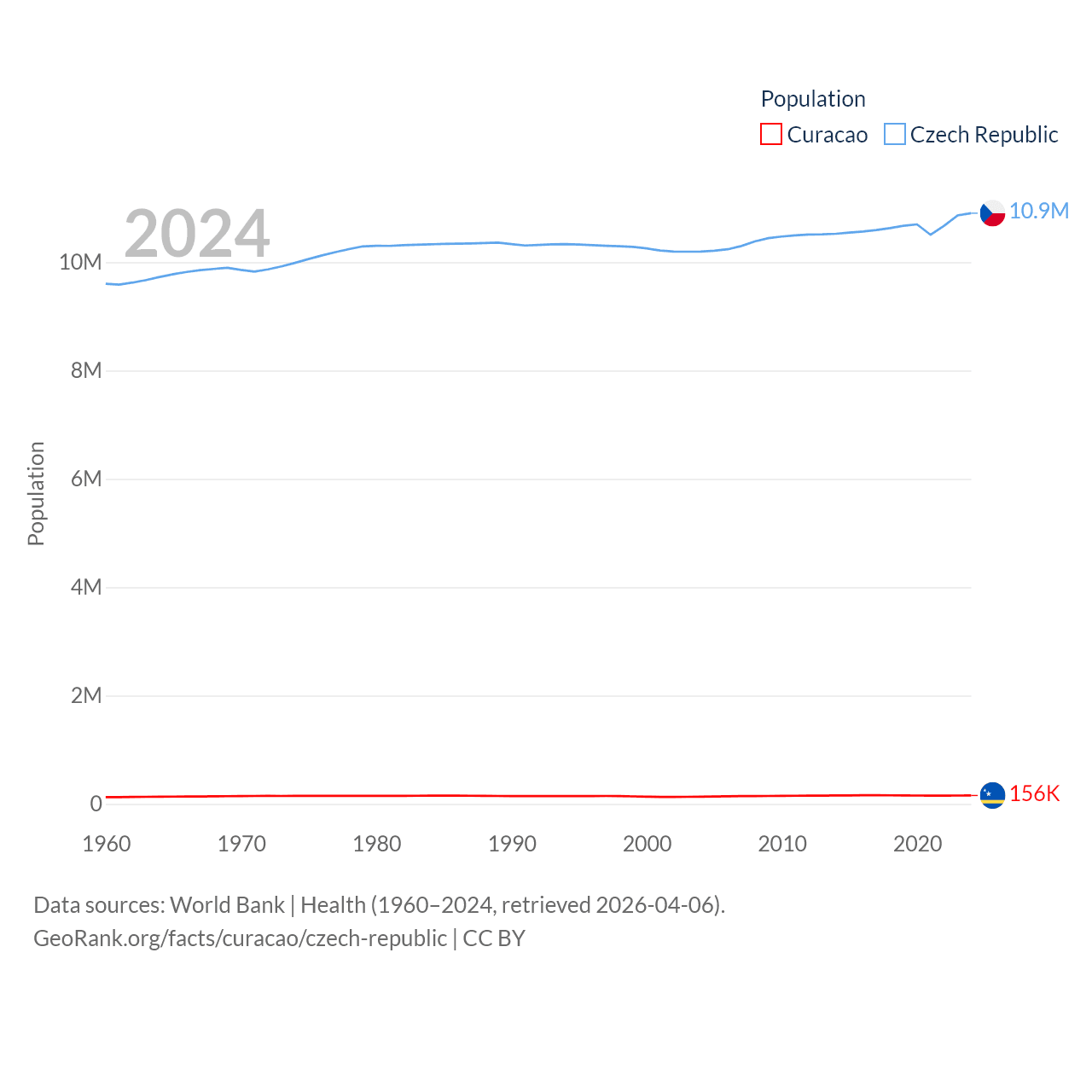 Curacao has a population of 156K (ranked 179/197), compared with 10.9M in The Czech Republic (ranked 88/197). Curacao's land area is 171.4 sq mi versus 29,794 sq mi for The Czech Republic (ranked 182nd vs. 114th).