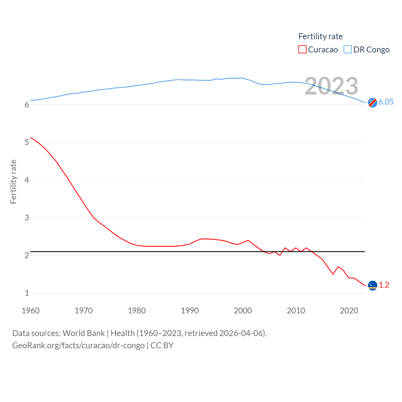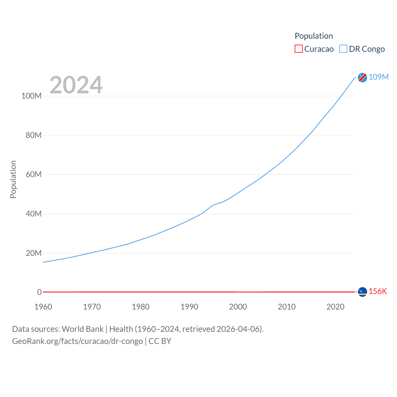 Curacao has a population of 156K (ranked 179/197), compared with 109M in The DR Congo (ranked 15/197). Curacao's land area is 171.4 sq mi versus 875,313 sq mi for The DR Congo (ranked 182nd vs. 11th).