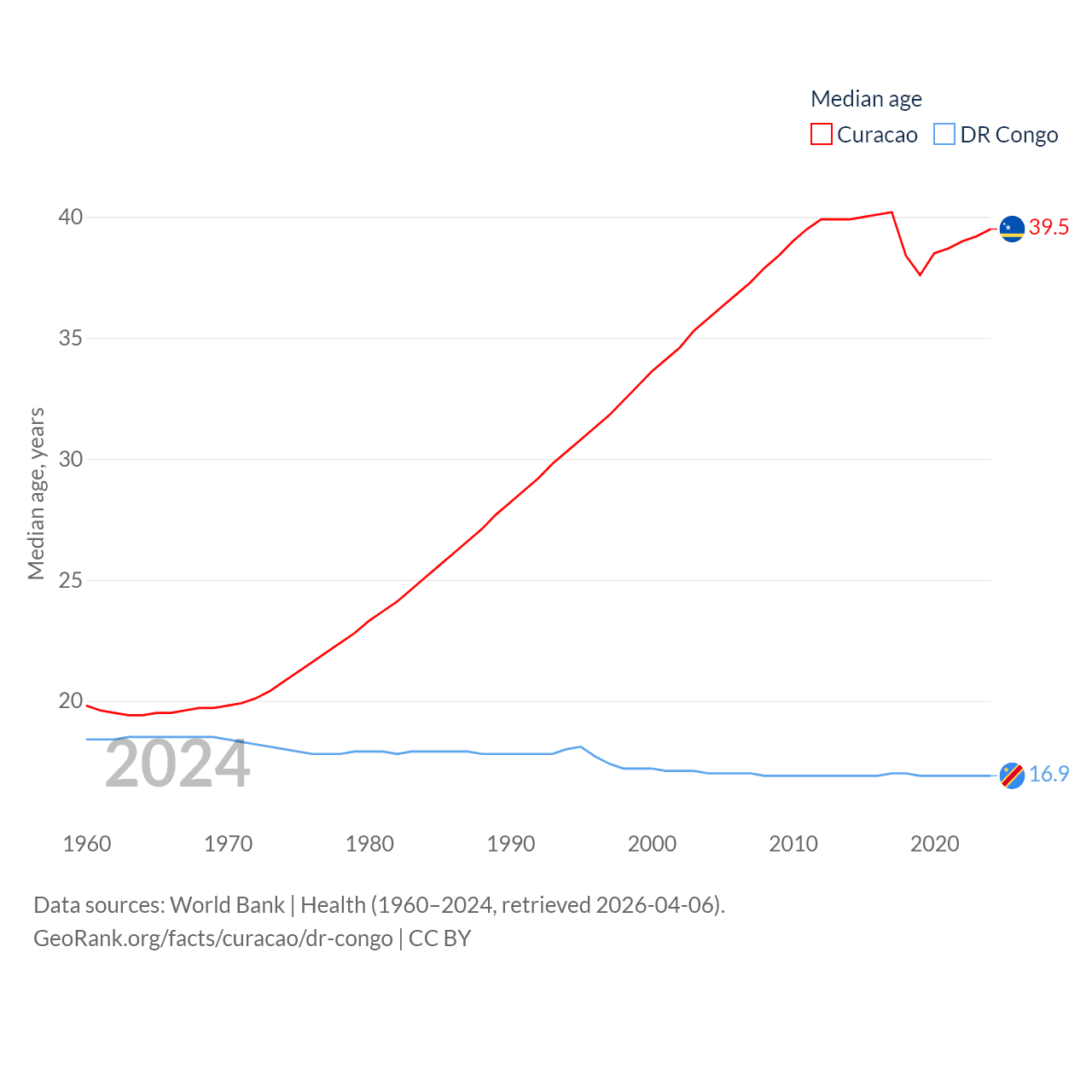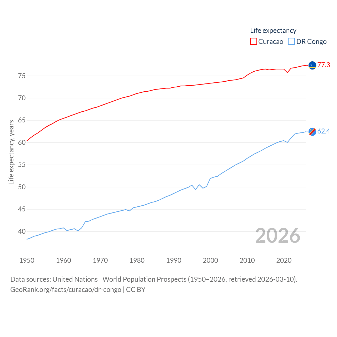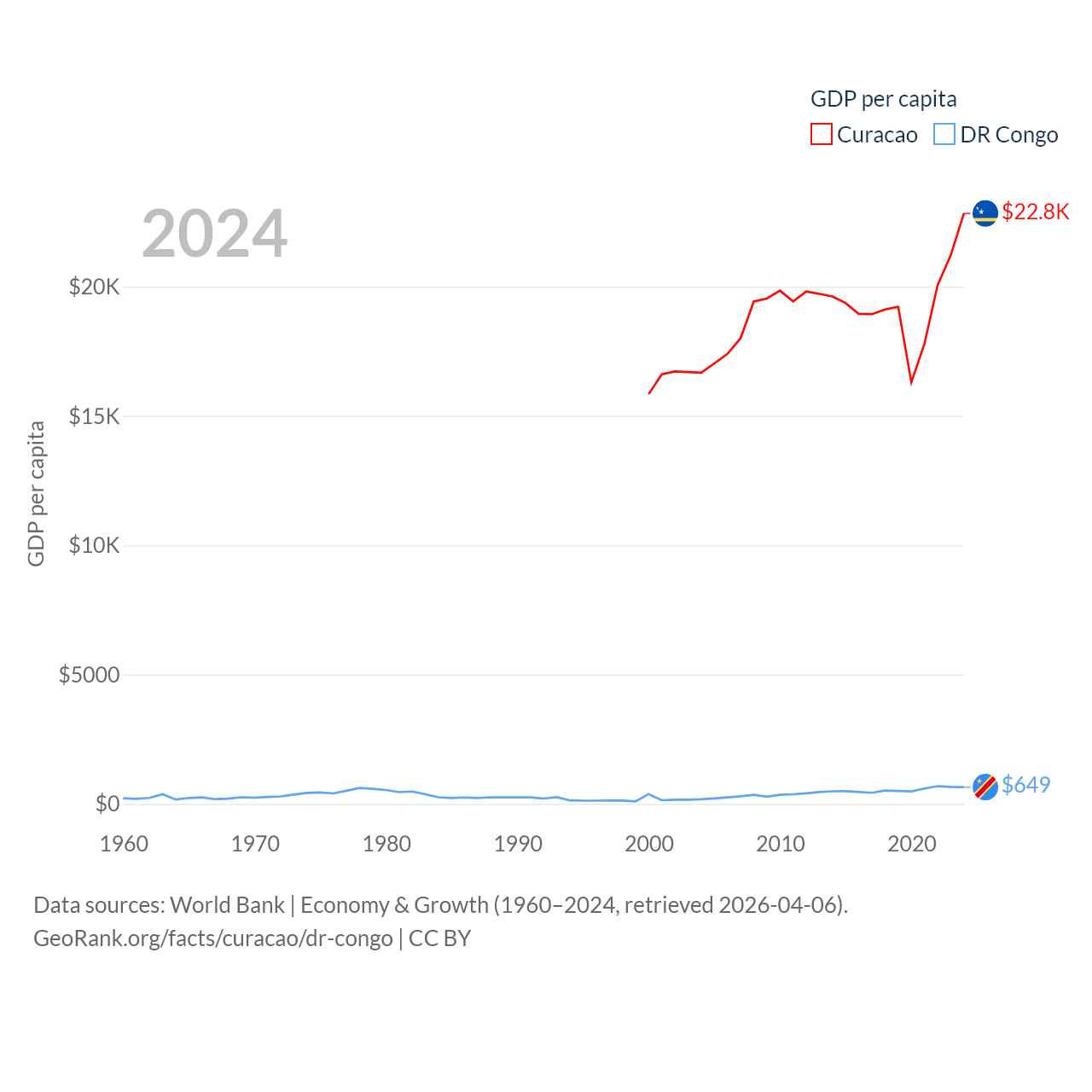 By GDP, Curacao ranks 167/197 ($3.56B) and The DR Congo ranks 87/197 ($71B). By GDP per capita, Curacao ranks 56/197 ($22,833), while The DR Congo ranks 190/197 ($649).