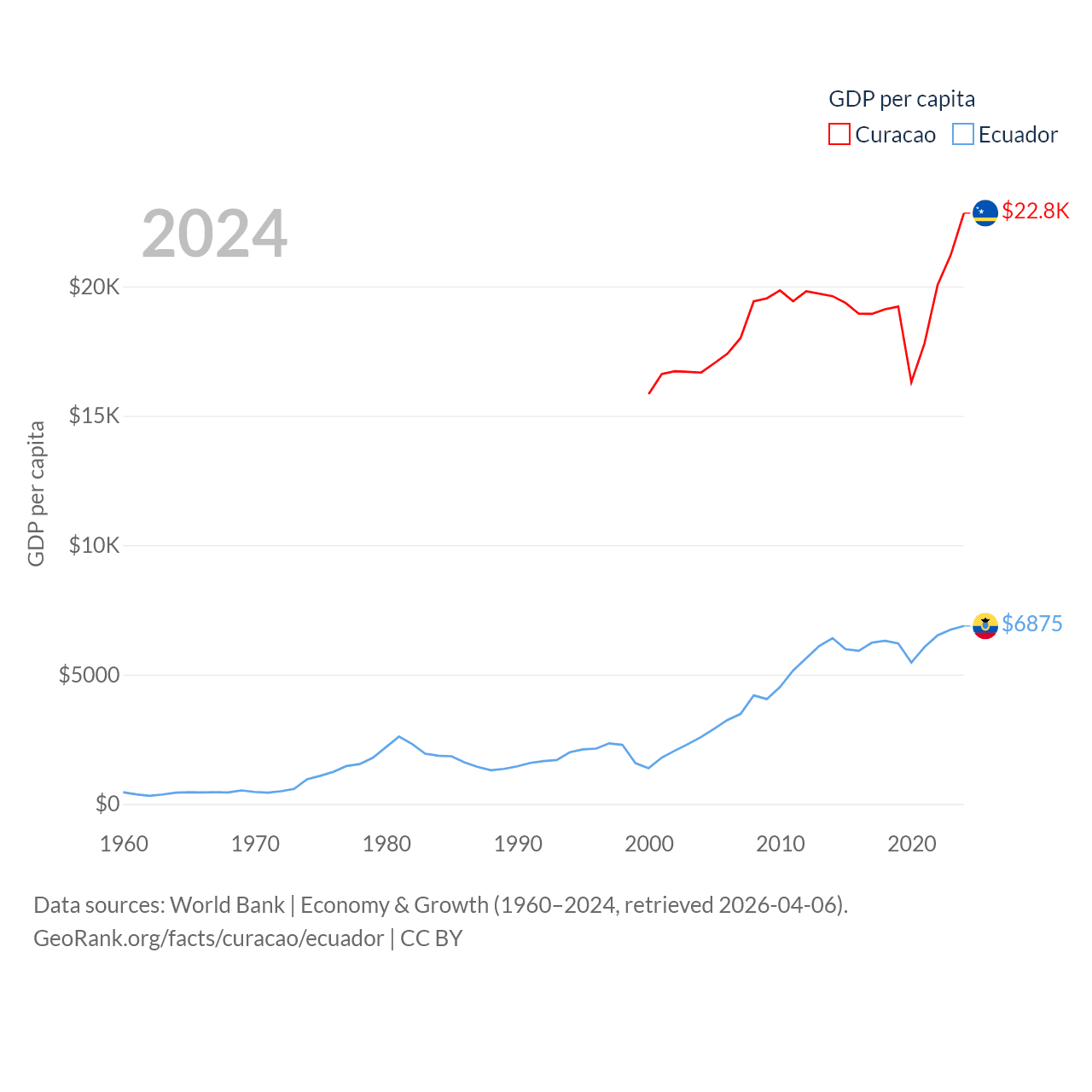 By GDP, Curacao ranks 167/197 ($3.56B) and Ecuador ranks 62/197 ($125B). By GDP per capita, Curacao ranks 56/197 ($22,833), while Ecuador ranks 103/197 ($6,875).