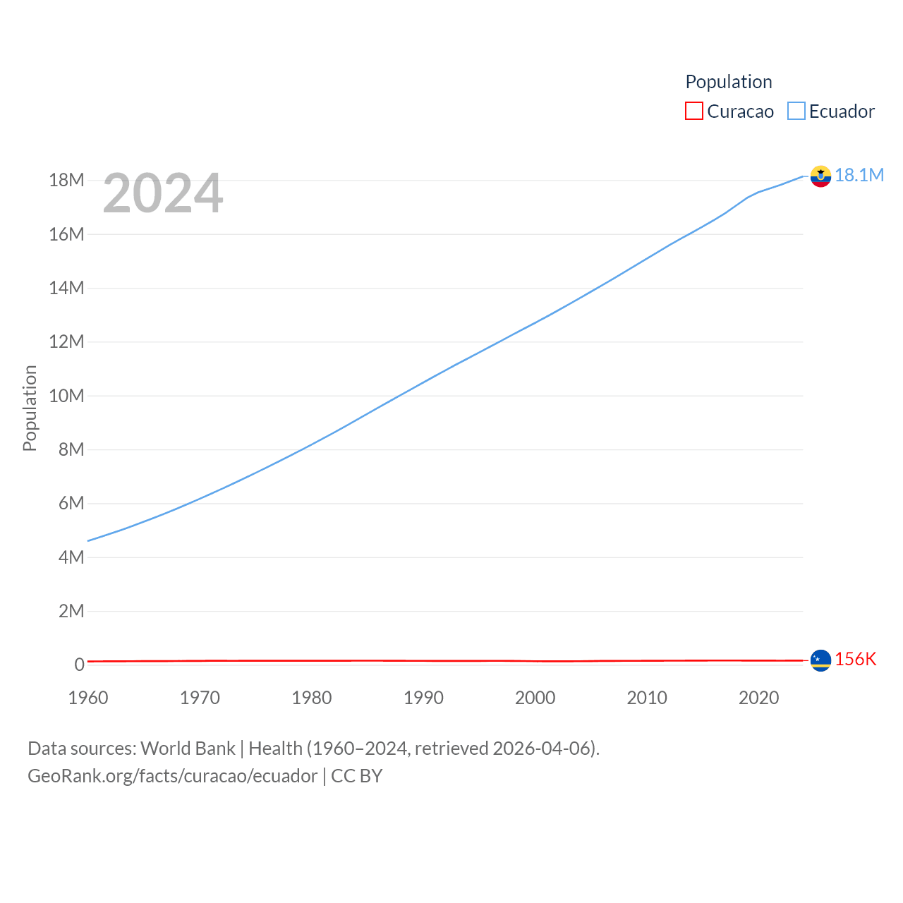 Curacao has a population of 156K (ranked 179/197), compared with 18.1M in Ecuador (ranked 71/197). Curacao's land area is 171.4 sq mi versus 95,892 sq mi for Ecuador (ranked 182nd vs. 76th).