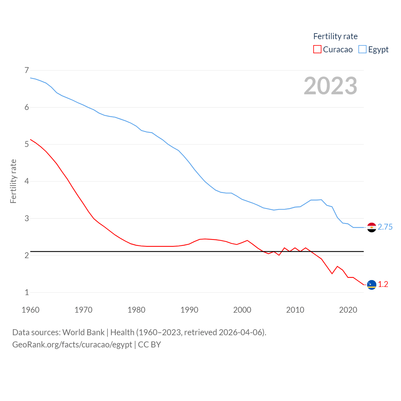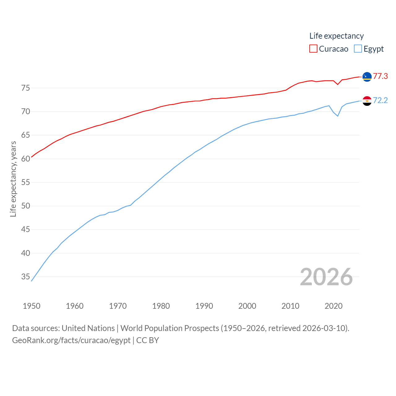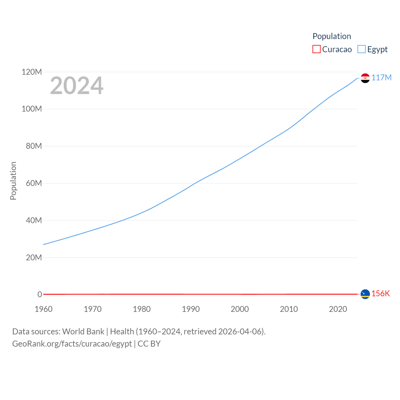 Curacao has a population of 156K (ranked 179/197), compared with 117M in Egypt (ranked 13/197). Curacao's land area is 171.4 sq mi versus 384,345 sq mi for Egypt (ranked 182nd vs. 29th).