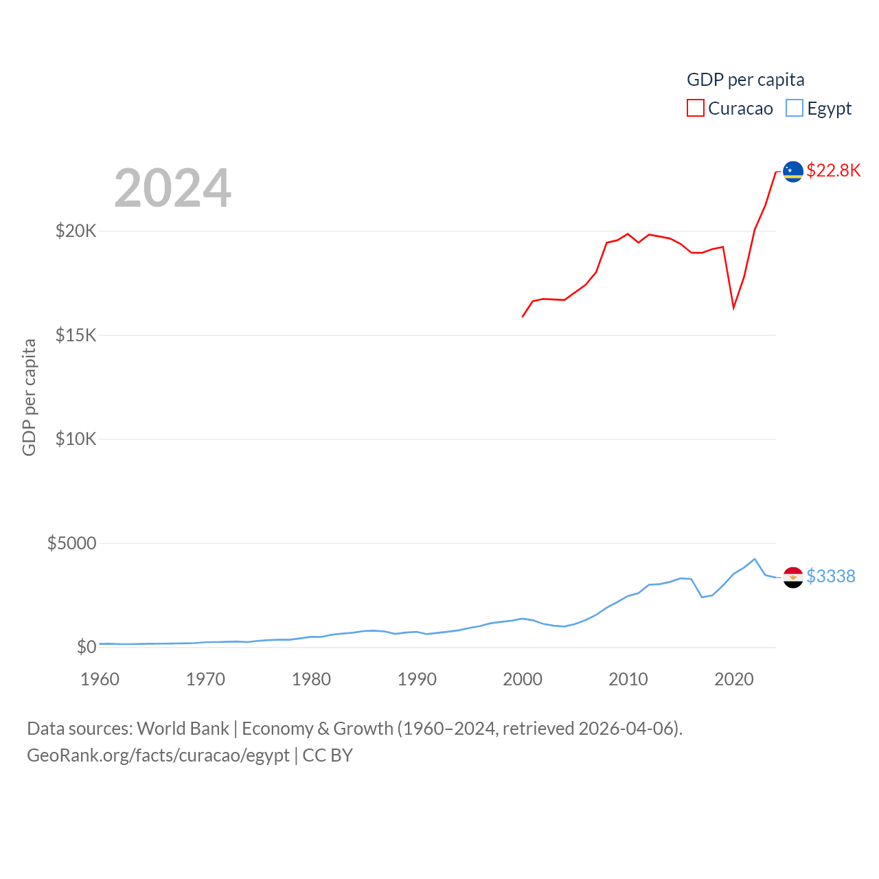 By GDP, Curacao ranks 167/197 ($3.56B) and Egypt ranks 41/197 ($389B). By GDP per capita, Curacao ranks 56/197 ($22,833), while Egypt ranks 138/197 ($3,338).