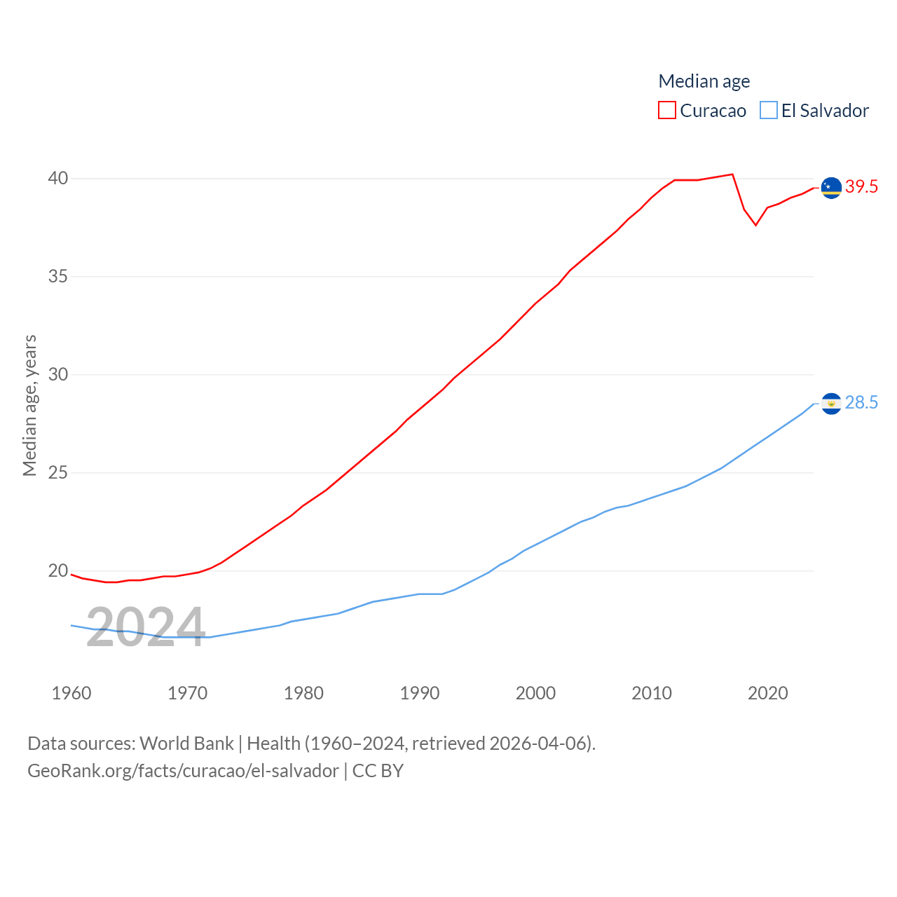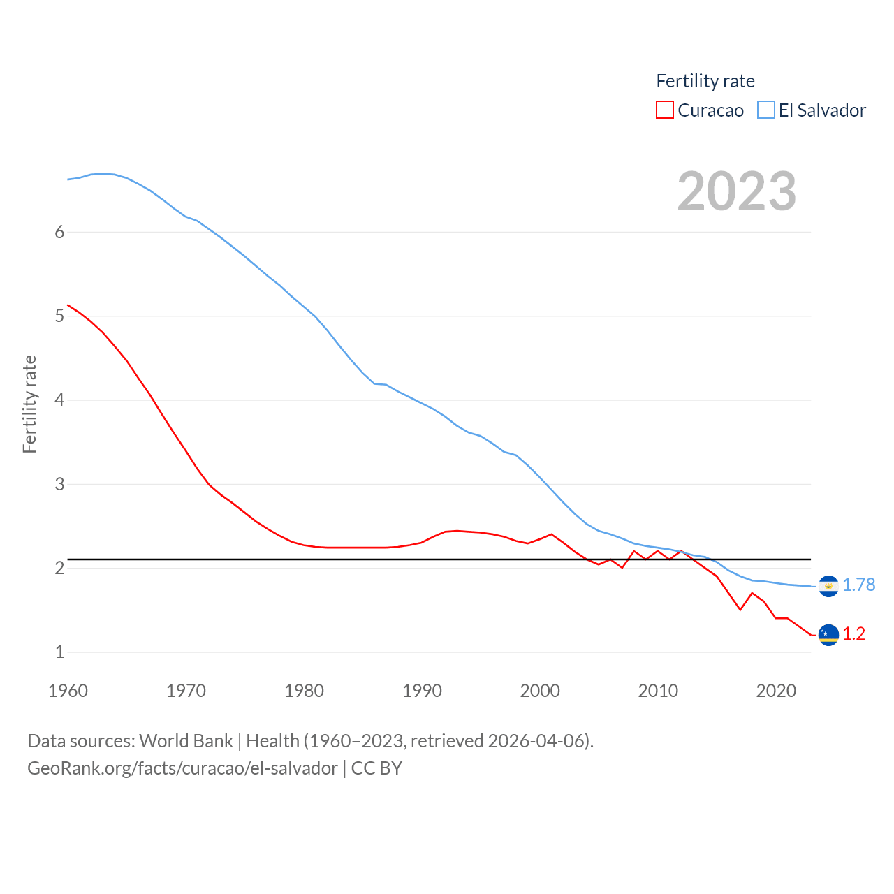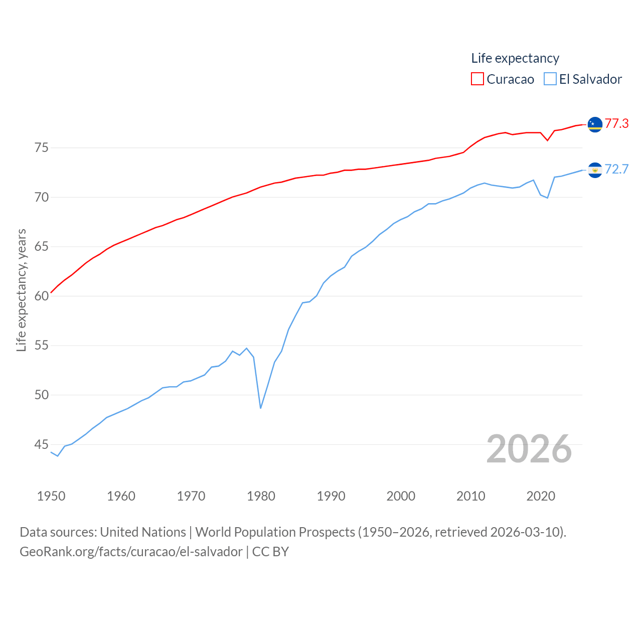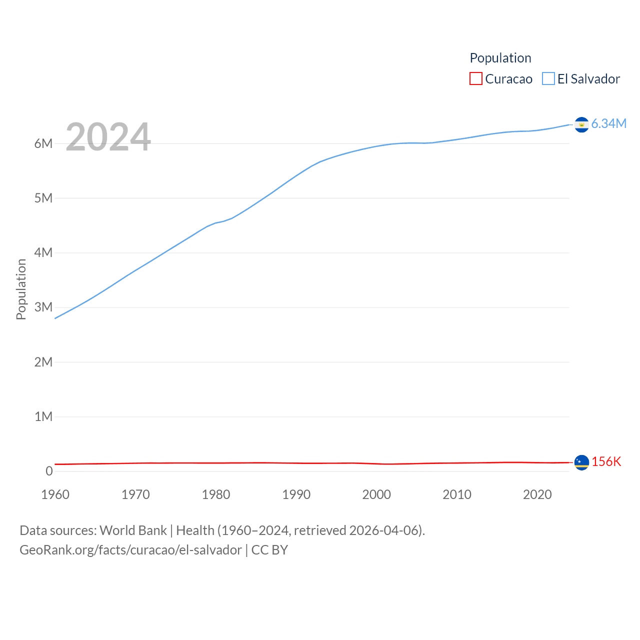 Curacao has a population of 156K (ranked 179/197), compared with 6.34M in El Salvador (ranked 111/197). Curacao's land area is 171.4 sq mi versus 8,000 sq mi for El Salvador (ranked 182nd vs. 150th).