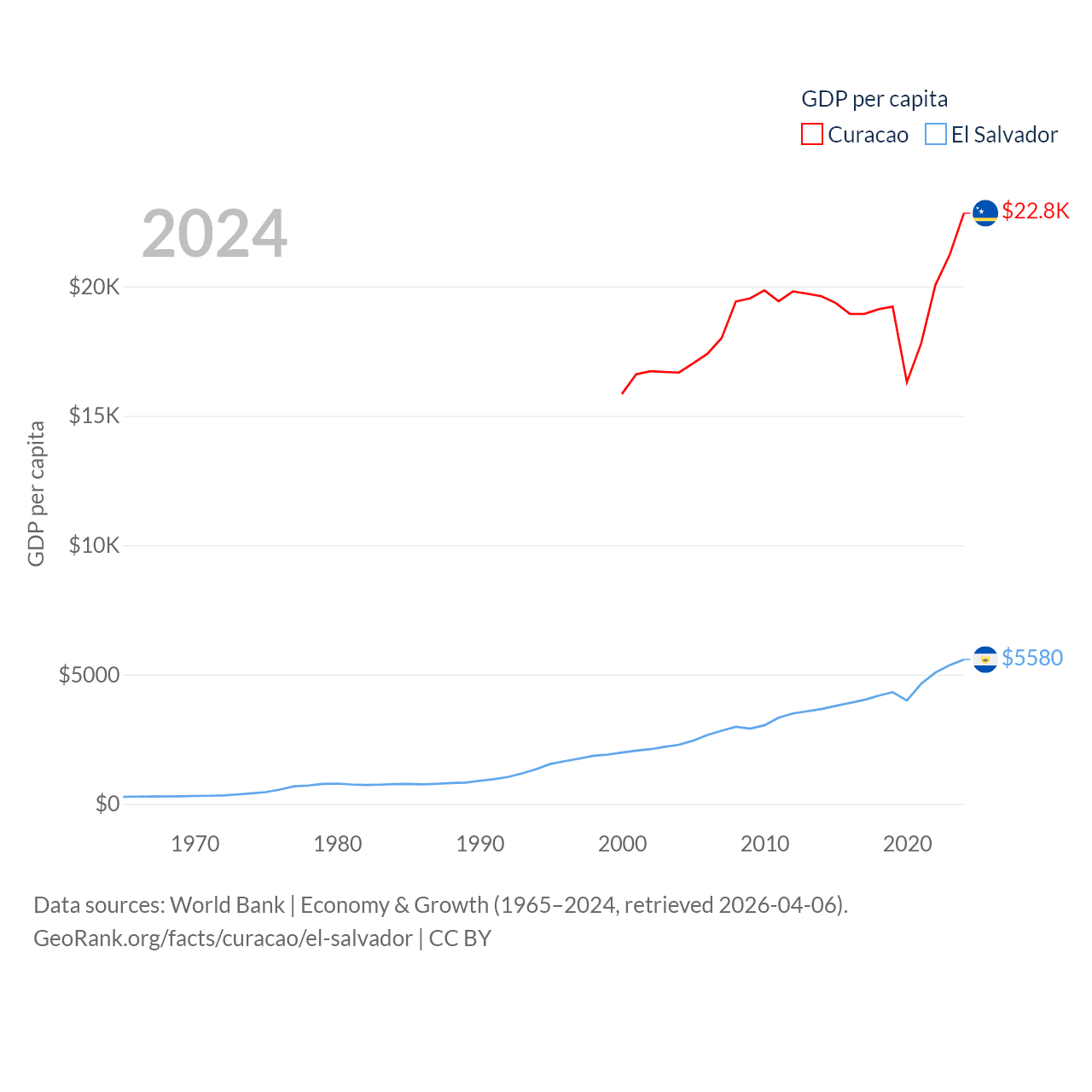 By GDP, Curacao ranks 167/197 ($3.56B) and El Salvador ranks 105/197 ($35.4B). By GDP per capita, Curacao ranks 56/197 ($22,833), while El Salvador ranks 116/197 ($5,580).