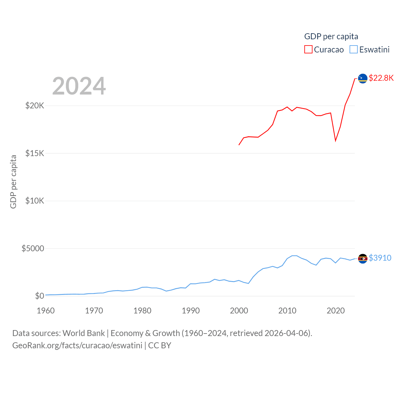 By GDP, Curacao ranks 167/197 ($3.56B) and Eswatini ranks 162/197 ($4.86B). By GDP per capita, Curacao ranks 56/197 ($22,833), while Eswatini ranks 131/197 ($3,910).