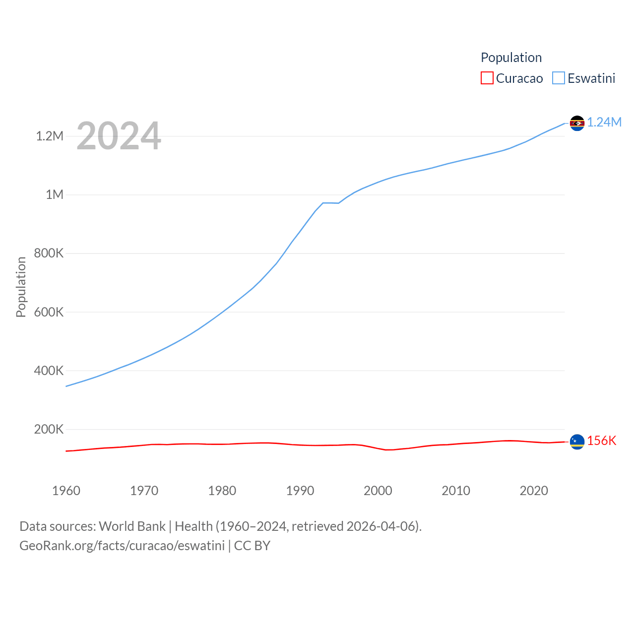 Curacao has a population of 156K (ranked 179/197), compared with 1.24M in Eswatini (ranked 157/197). Curacao's land area is 171.4 sq mi versus 6,641 sq mi for Eswatini (ranked 182nd vs. 154th).