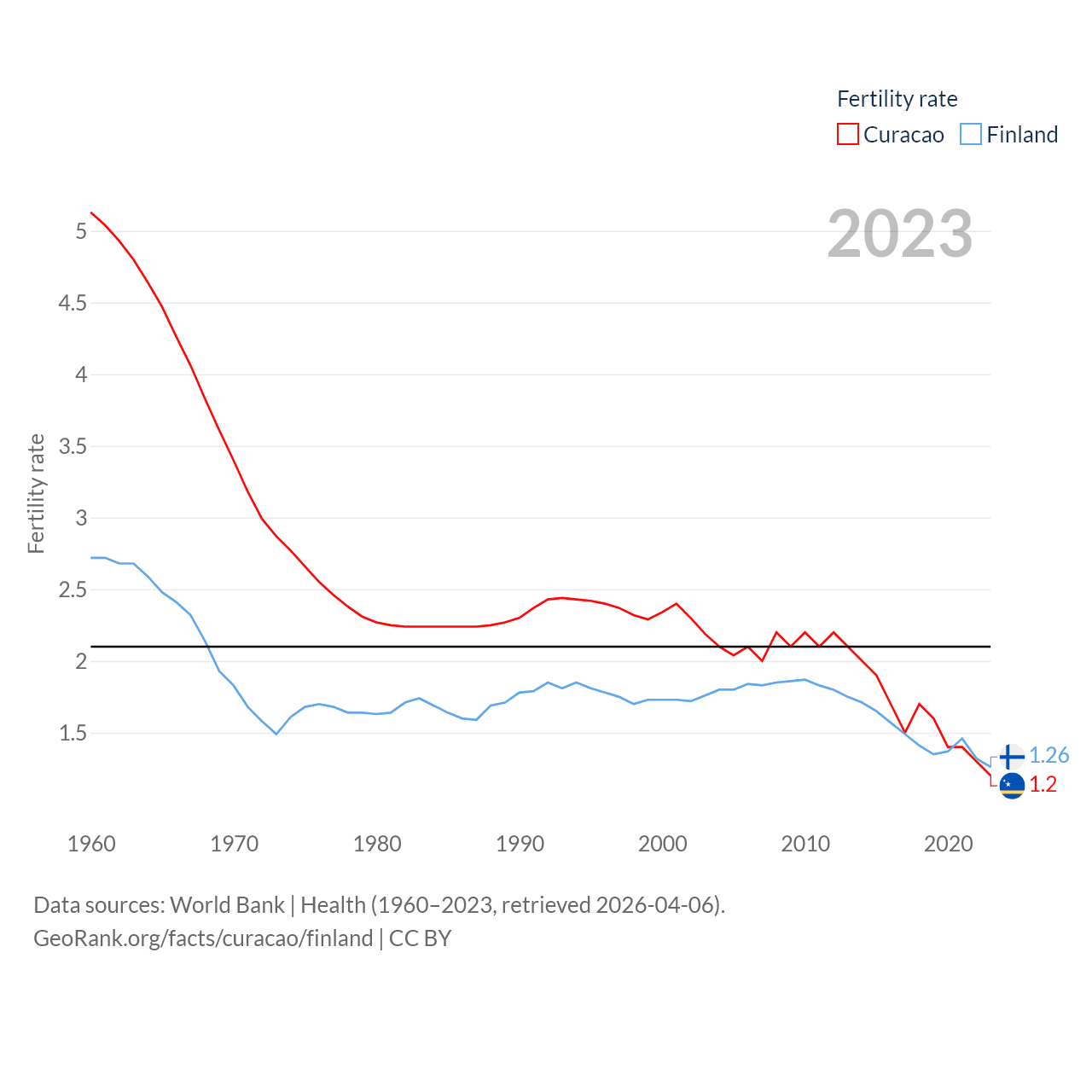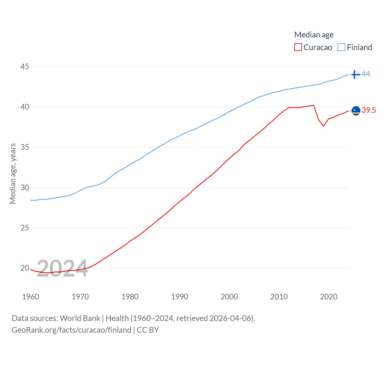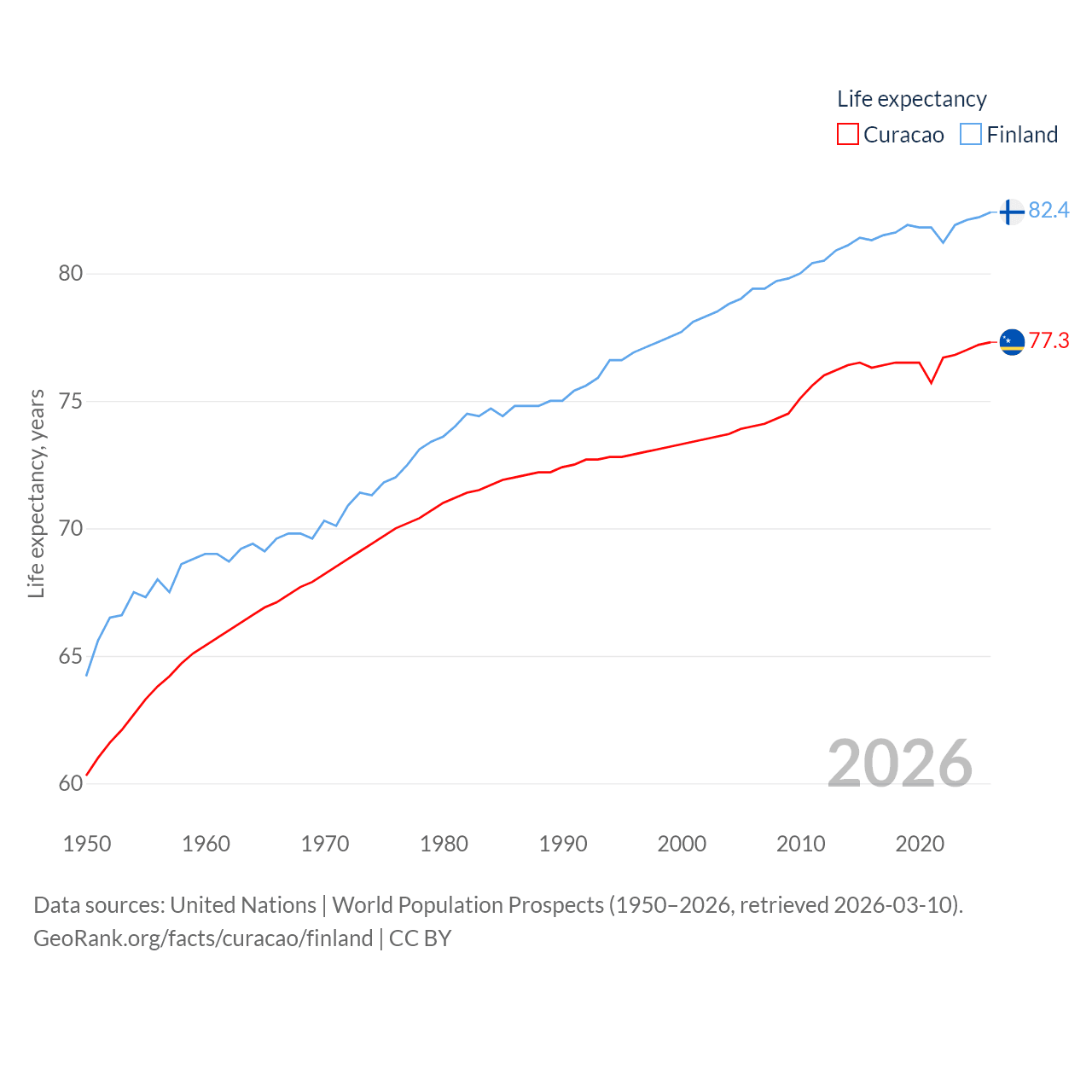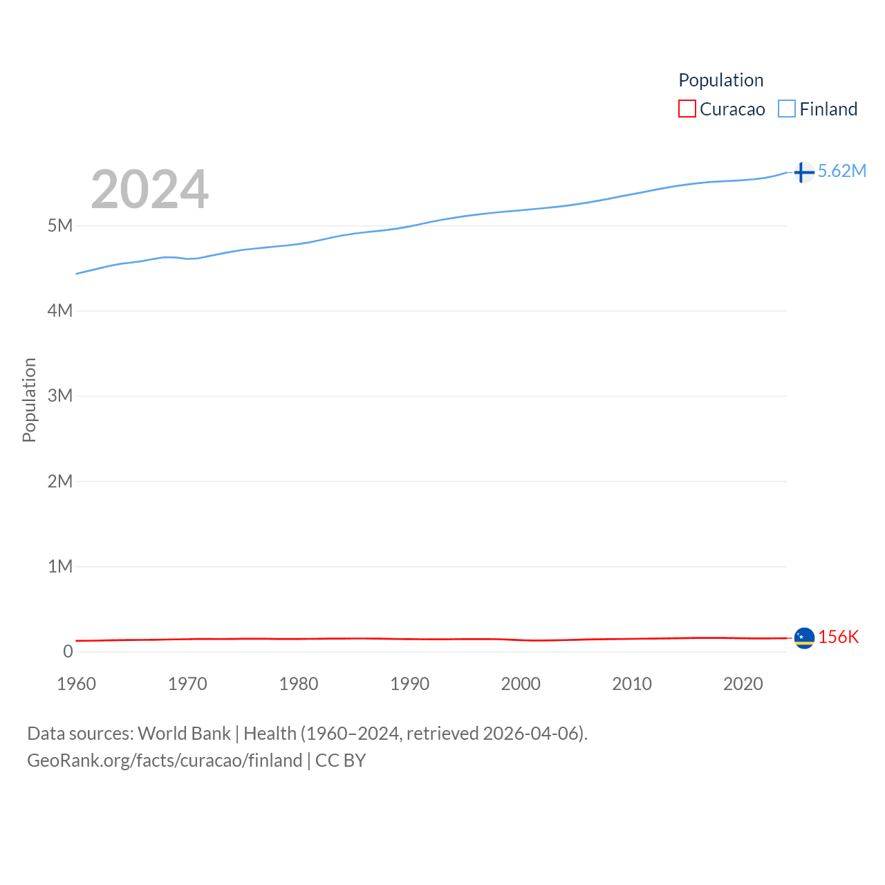 Curacao has a population of 156K (ranked 179/197), compared with 5.62M in Finland (ranked 116/197). Curacao's land area is 171.4 sq mi versus 117,360 sq mi for Finland (ranked 182nd vs. 70th).