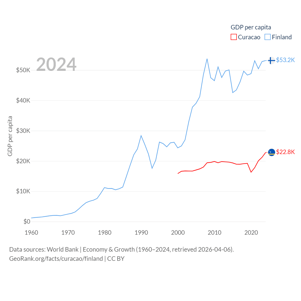 By GDP, Curacao ranks 167/197 ($3.56B) and Finland ranks 47/197 ($299B). By GDP per capita, Curacao ranks 56/197 ($22,833), while Finland ranks 23/197 ($53,150).