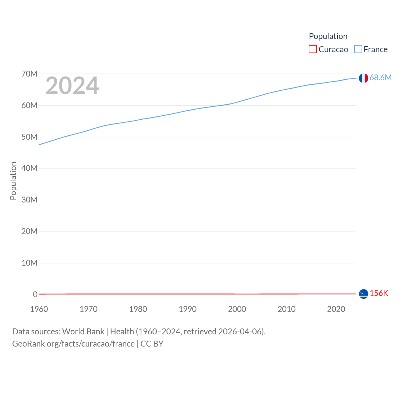 Curacao has a population of 156K (ranked 179/197), compared with 68.6M in France (ranked 23/197). Curacao's land area is 171.4 sq mi versus 208,090 sq mi for France (ranked 182nd vs. 48th).