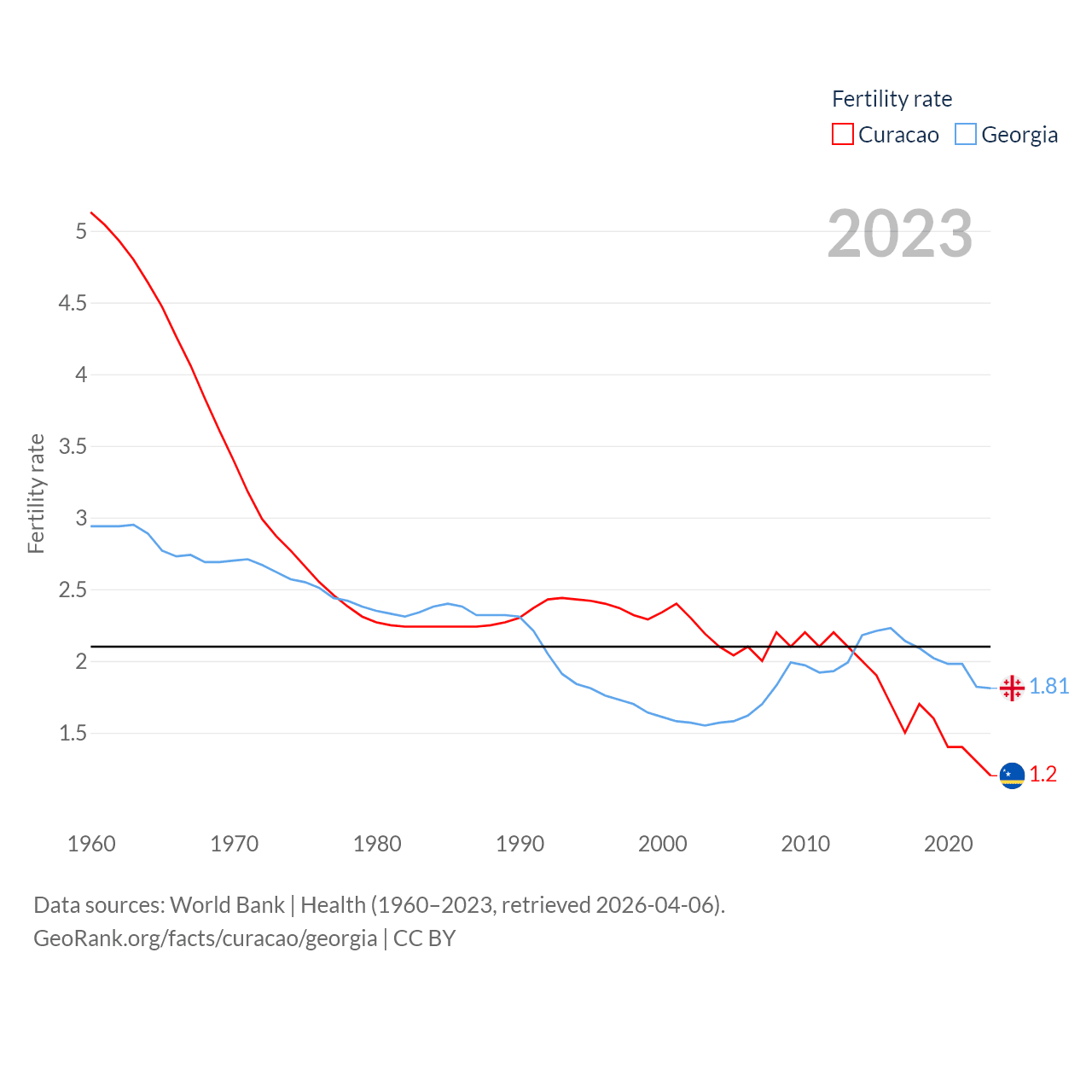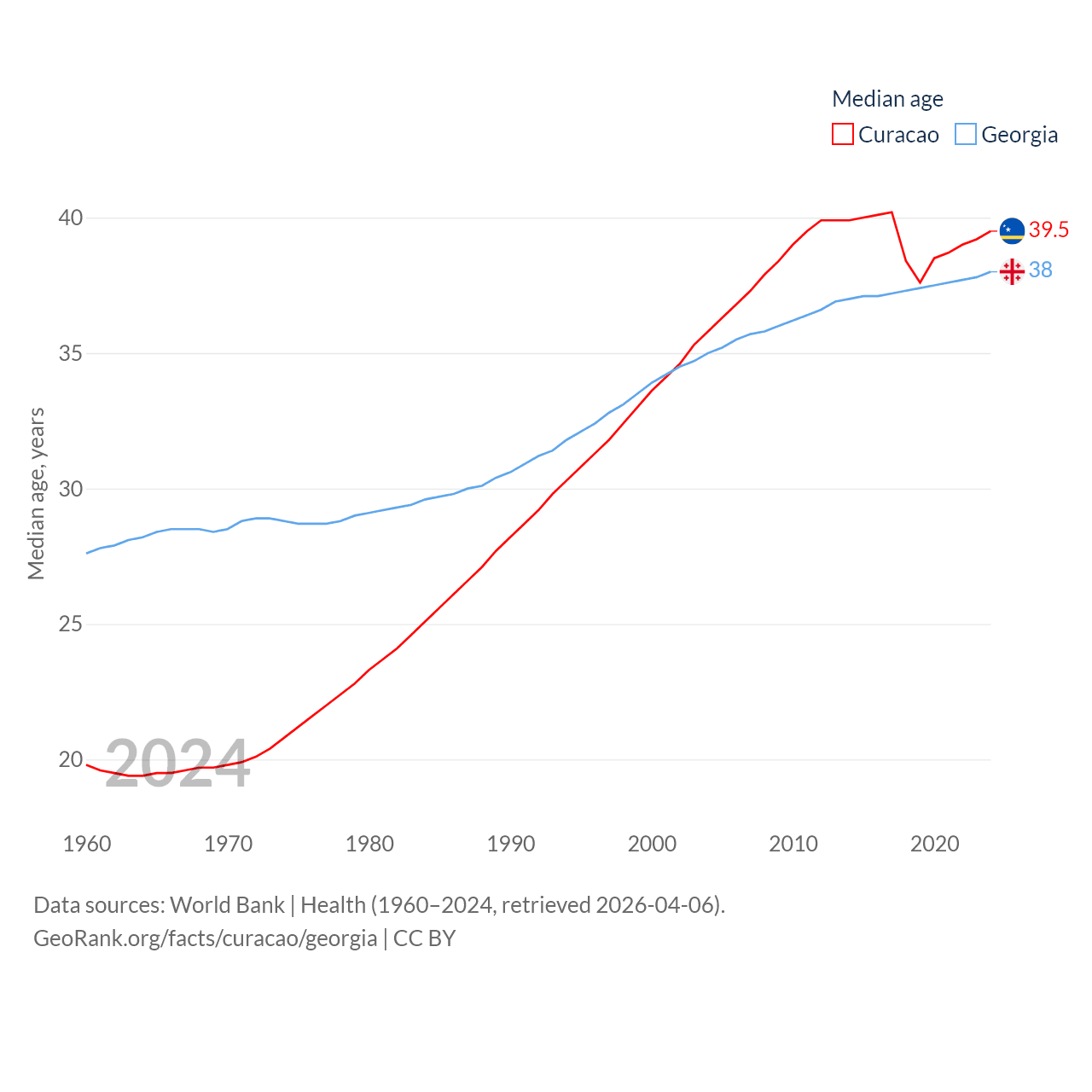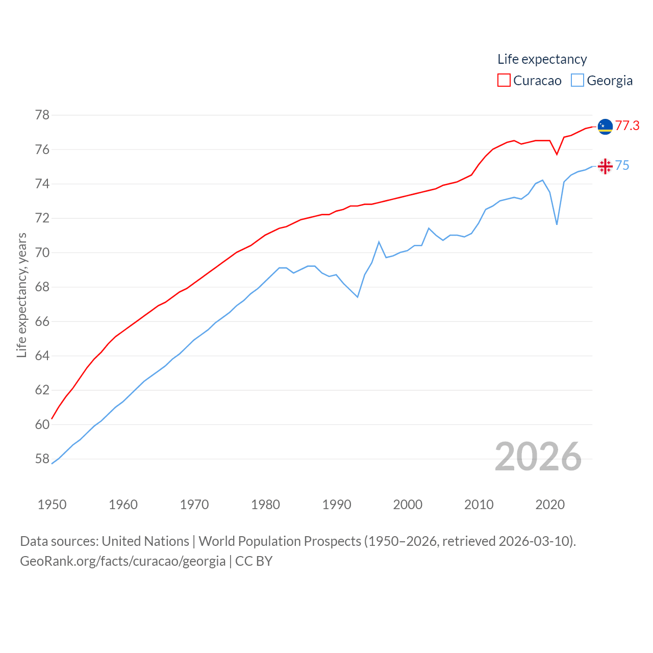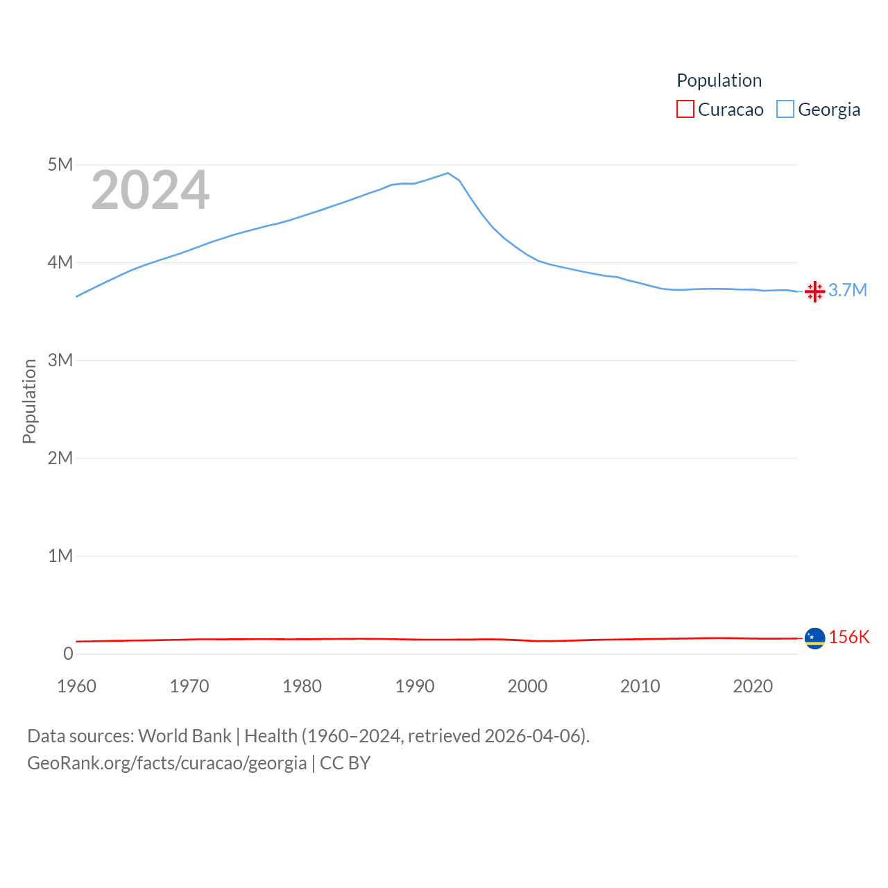 Curacao has a population of 156K (ranked 179/197), compared with 3.7M in Georgia (ranked 130/197). Curacao's land area is 171.4 sq mi versus 26,830 sq mi for Georgia (ranked 182nd vs. 118th).