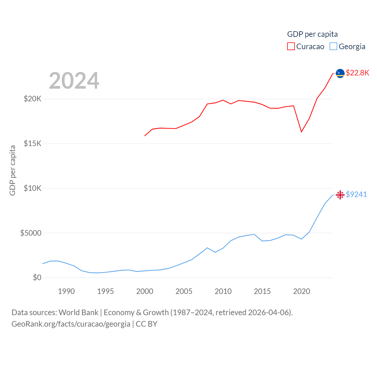 By GDP, Curacao ranks 167/197 ($3.56B) and Georgia ranks 107/197 ($34.2B). By GDP per capita, Curacao ranks 56/197 ($22,833), while Georgia ranks 89/197 ($9,241).