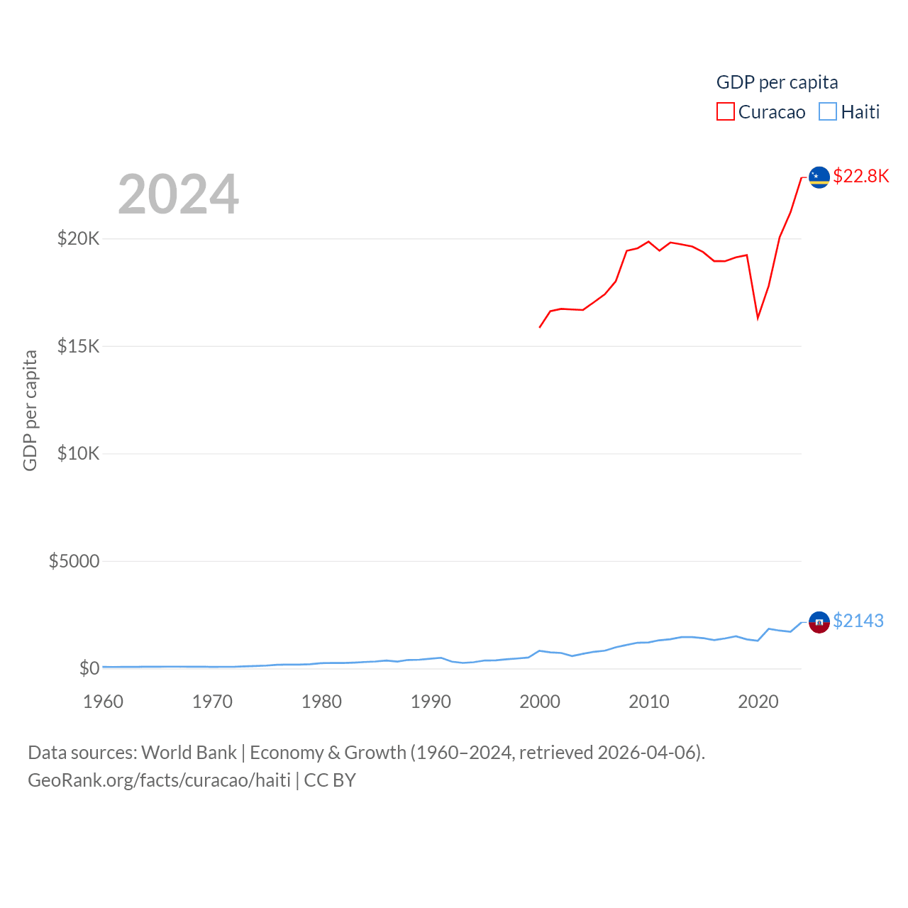 By GDP, Curacao ranks 167/197 ($3.56B) and Haiti ranks 117/197 ($25.2B). By GDP per capita, Curacao ranks 56/197 ($22,833), while Haiti ranks 153/197 ($2,143).