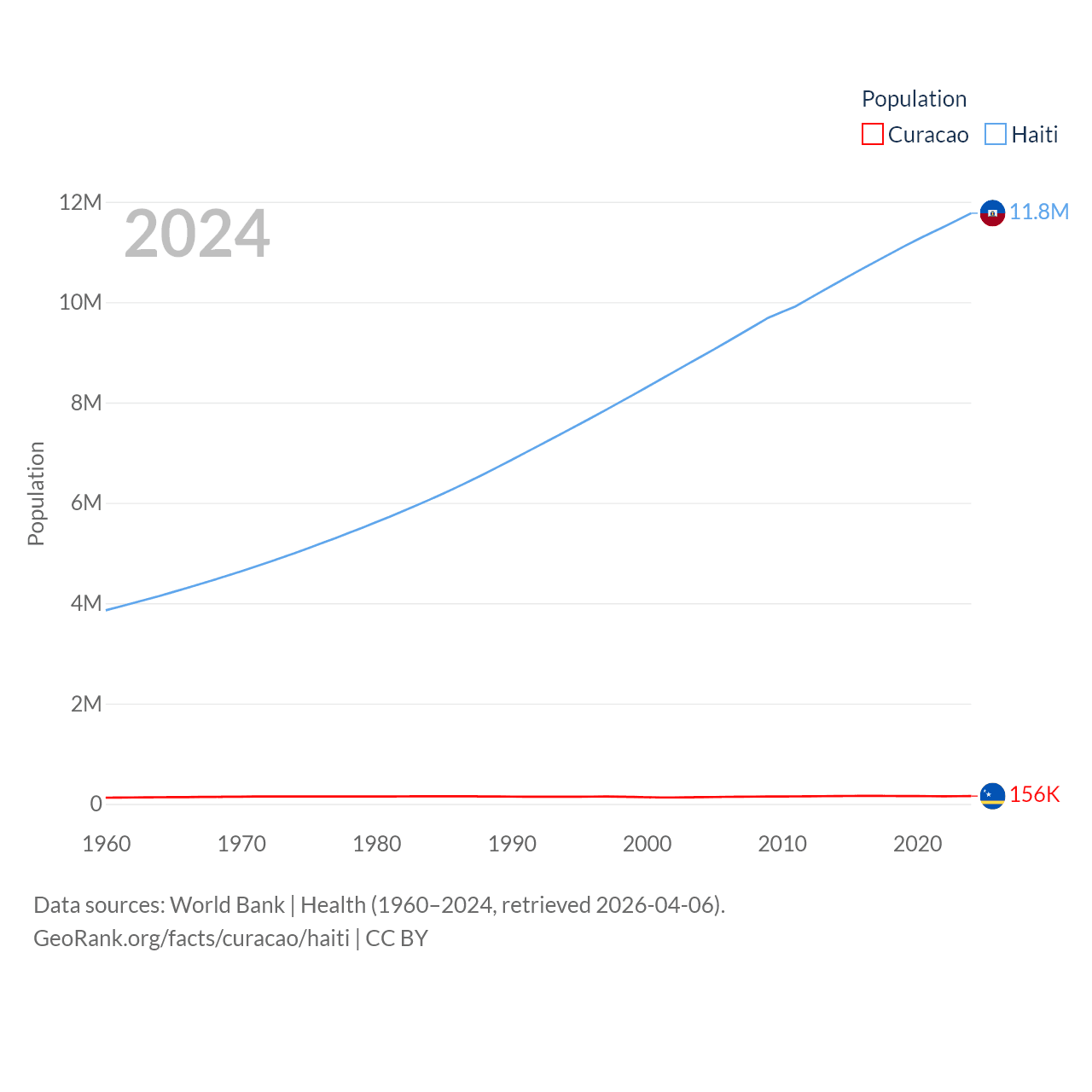 Curacao has a population of 156K (ranked 179/197), compared with 11.8M in Haiti (ranked 83/197). Curacao's land area is 171.4 sq mi versus 10,641 sq mi for Haiti (ranked 182nd vs. 142nd).