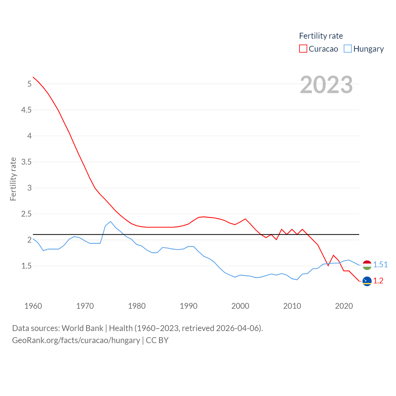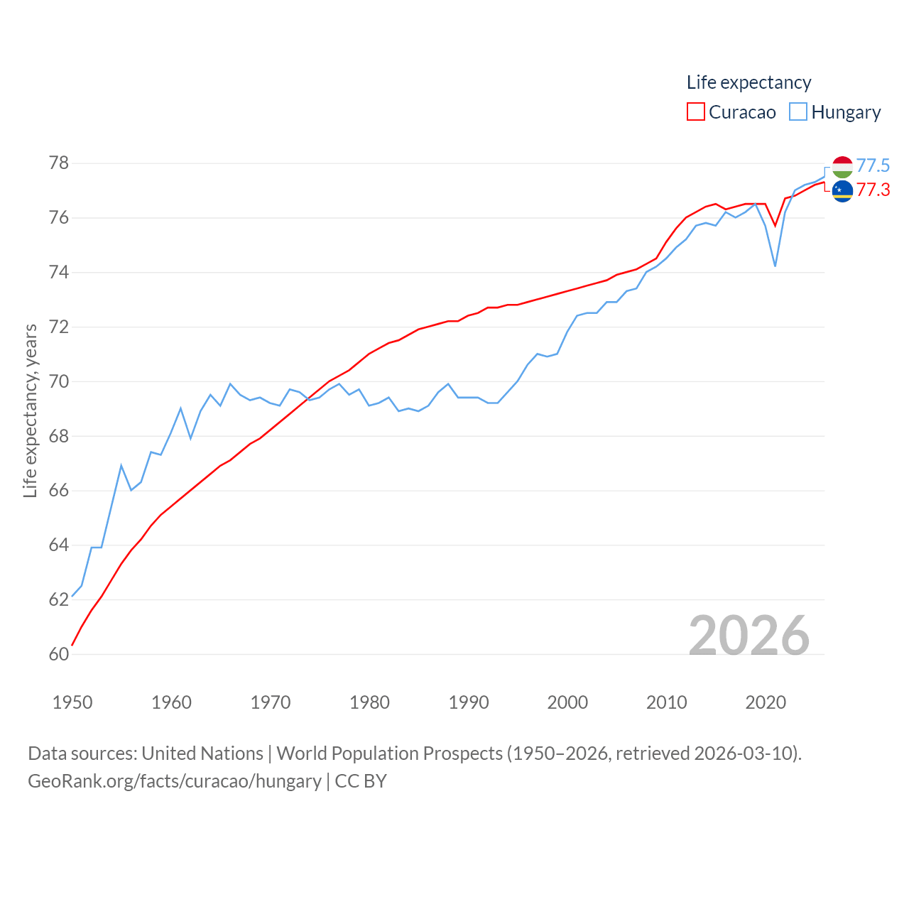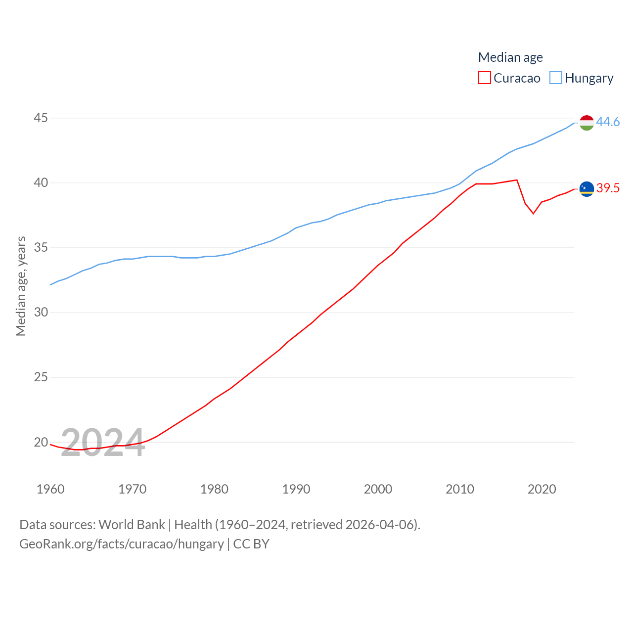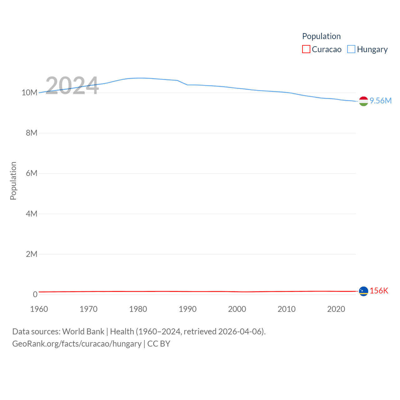 Curacao has a population of 156K (ranked 179/197), compared with 9.56M in Hungary (ranked 97/197). Curacao's land area is 171.4 sq mi versus 35,236 sq mi for Hungary (ranked 182nd vs. 109th).