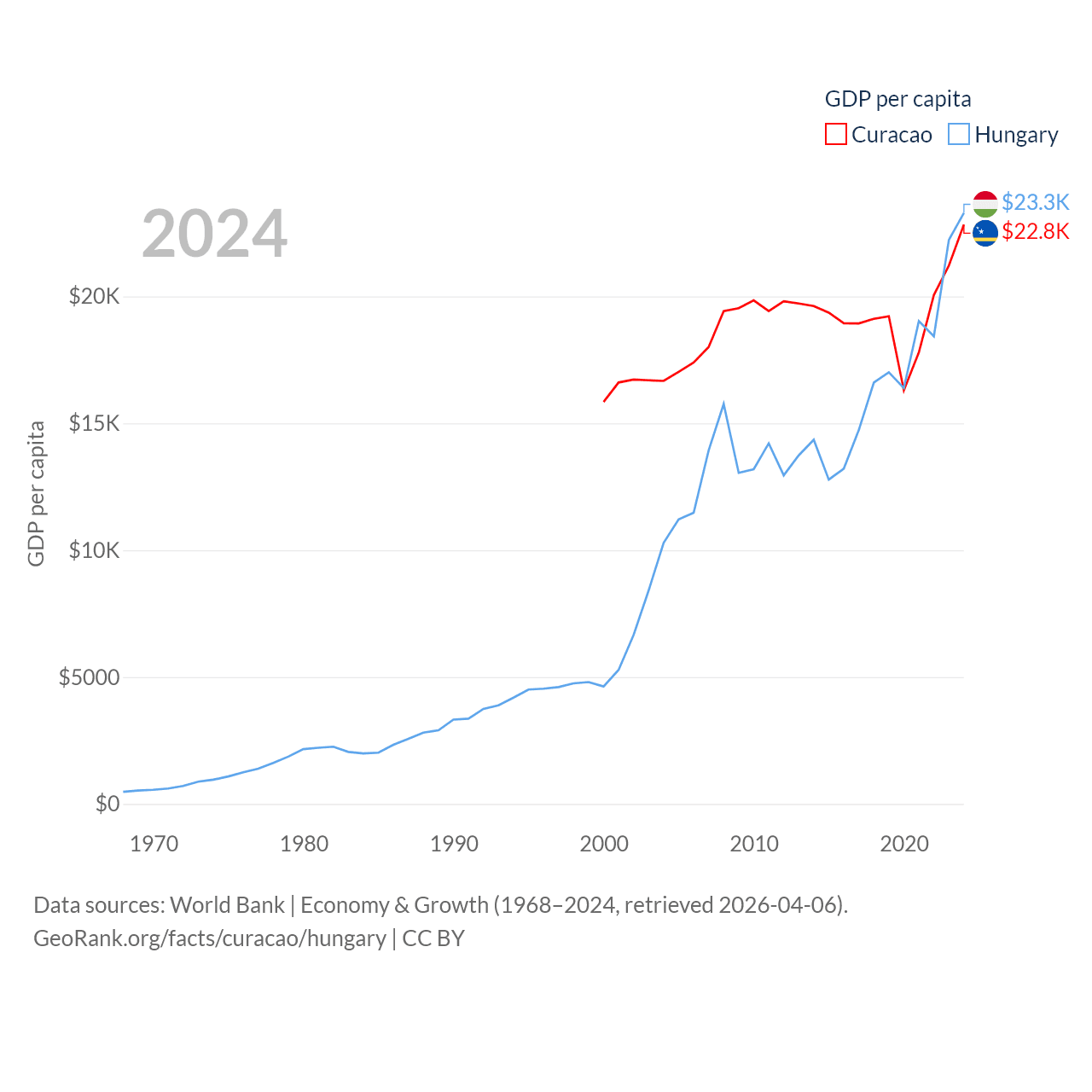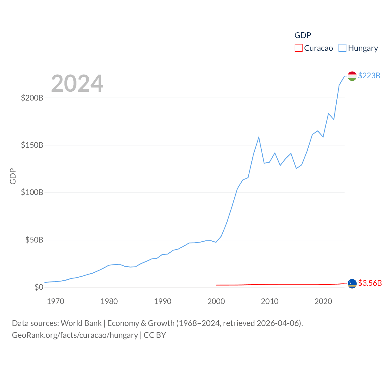 By GDP, Curacao ranks 167/197 ($3.56B) and Hungary ranks 55/197 ($223B). By GDP per capita, Curacao ranks 56/197 ($22,833), while Hungary ranks 55/197 ($23,292).