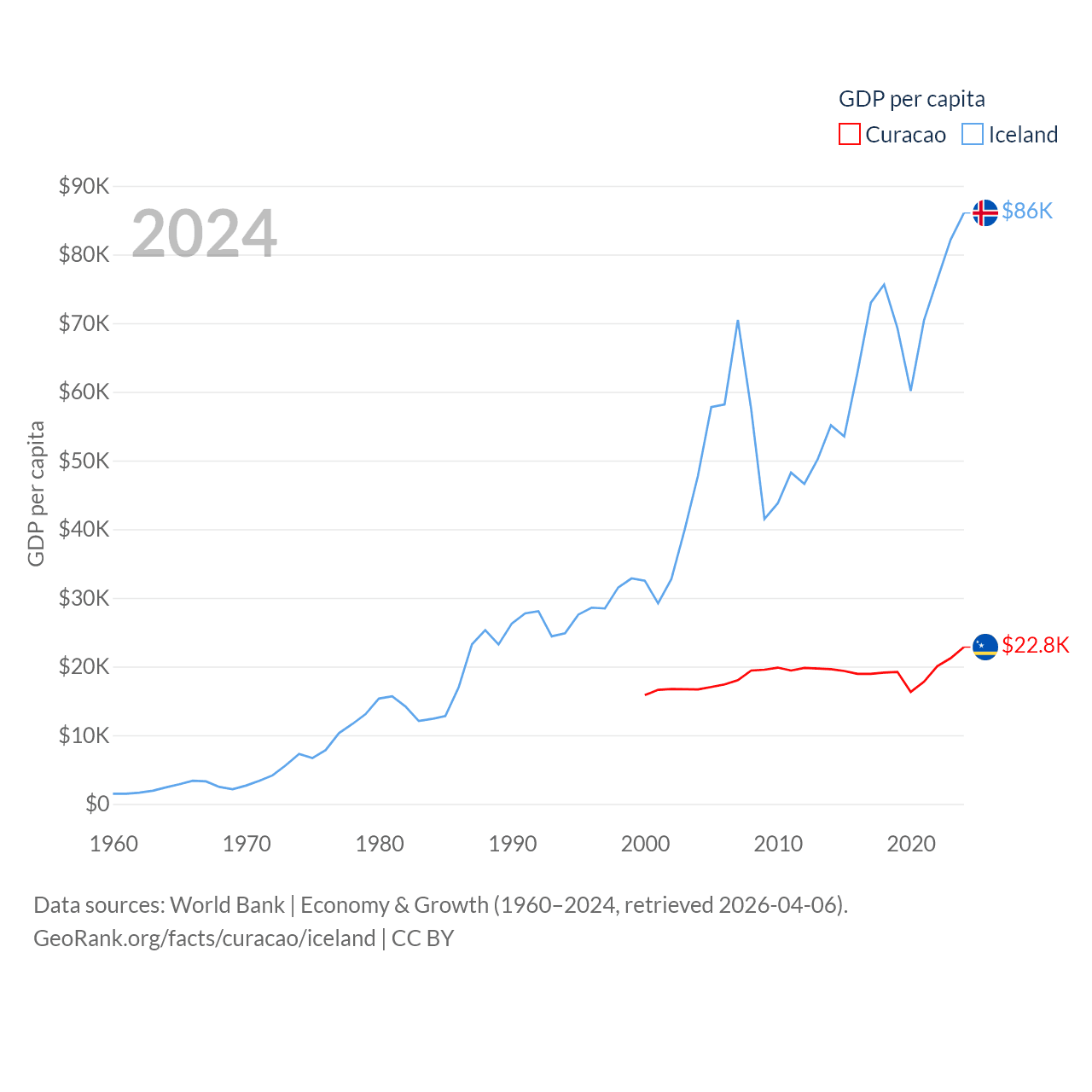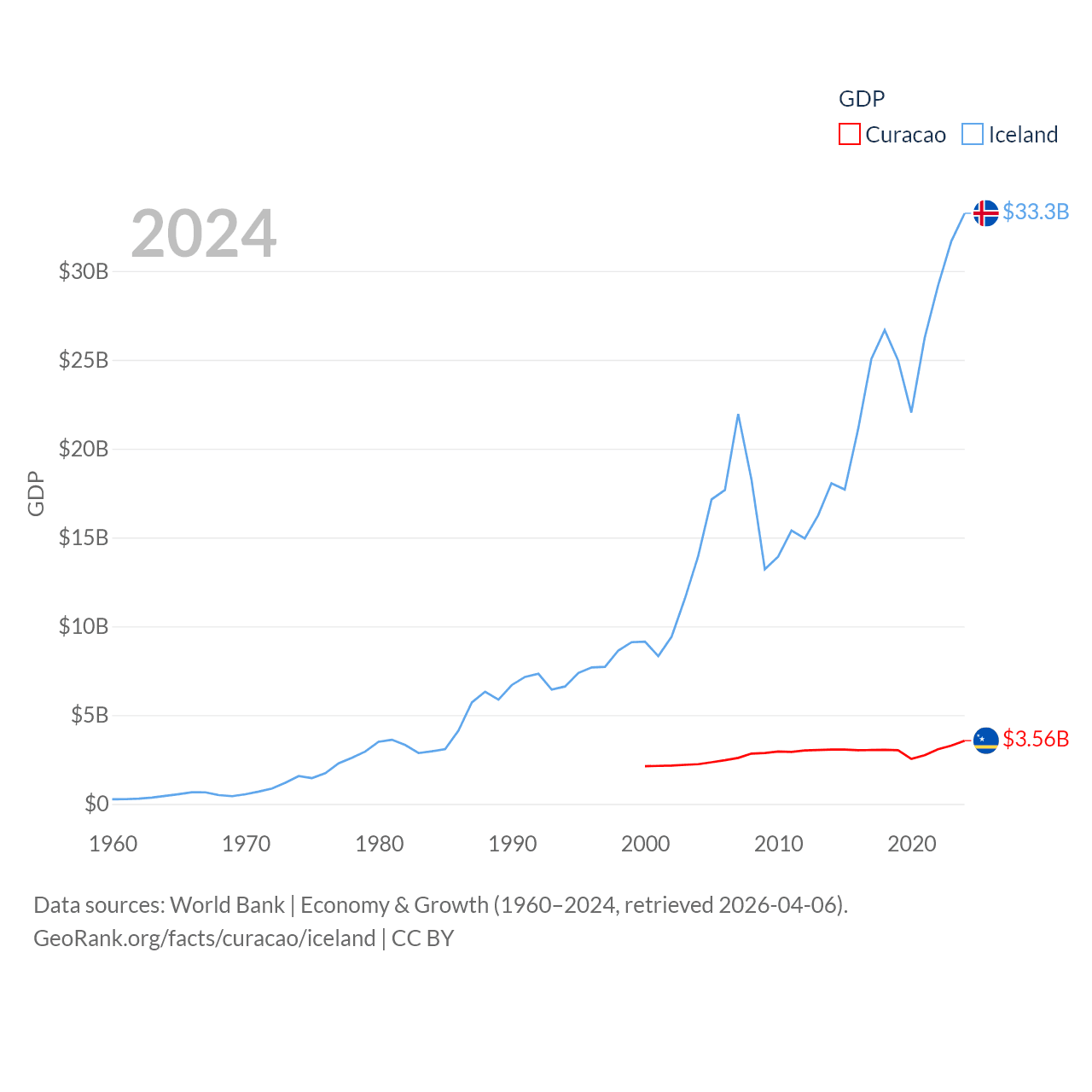 By GDP, Curacao ranks 167/197 ($3.56B) and Iceland ranks 108/197 ($33.3B). By GDP per capita, Curacao ranks 56/197 ($22,833), while Iceland ranks 9/197 ($86,041).