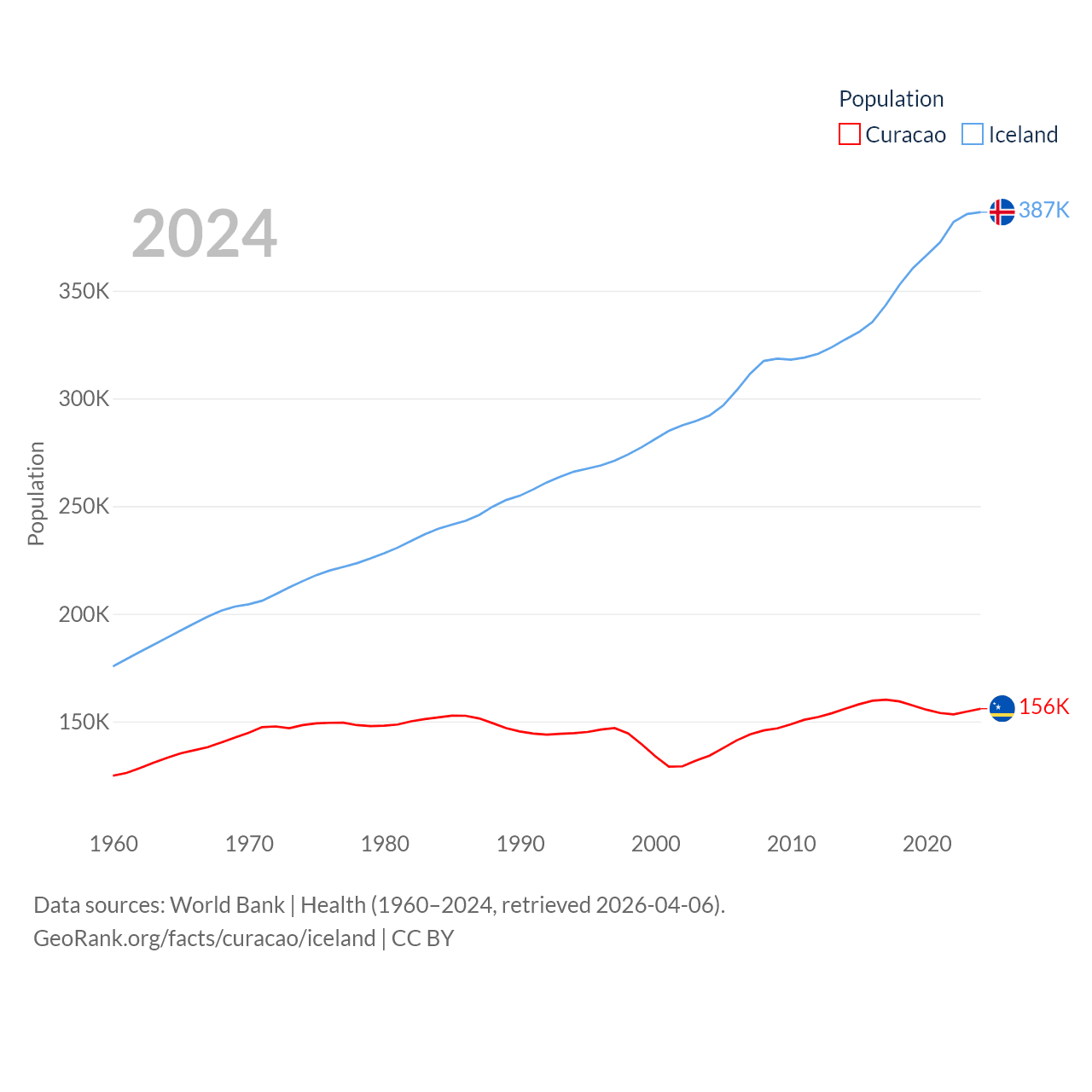 Curacao has a population of 156K (ranked 179/197), compared with 387K in Iceland (ranked 173/197). Curacao's land area is 171.4 sq mi versus 38,931 sq mi for Iceland (ranked 182nd vs. 104th).