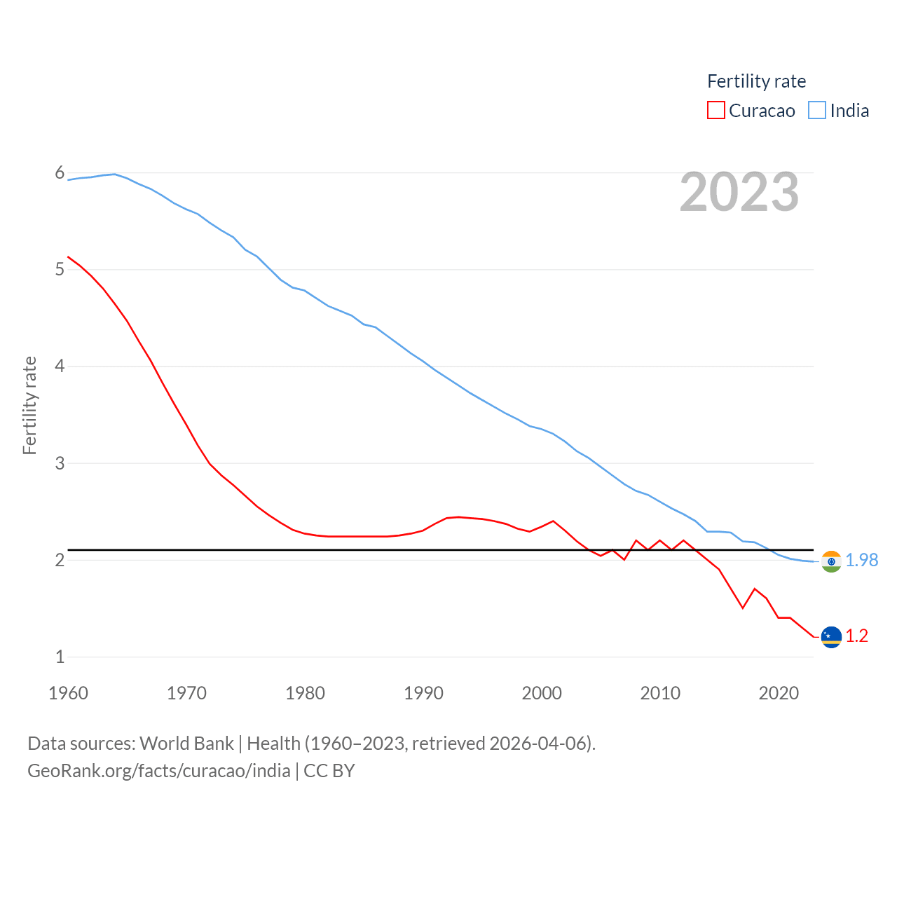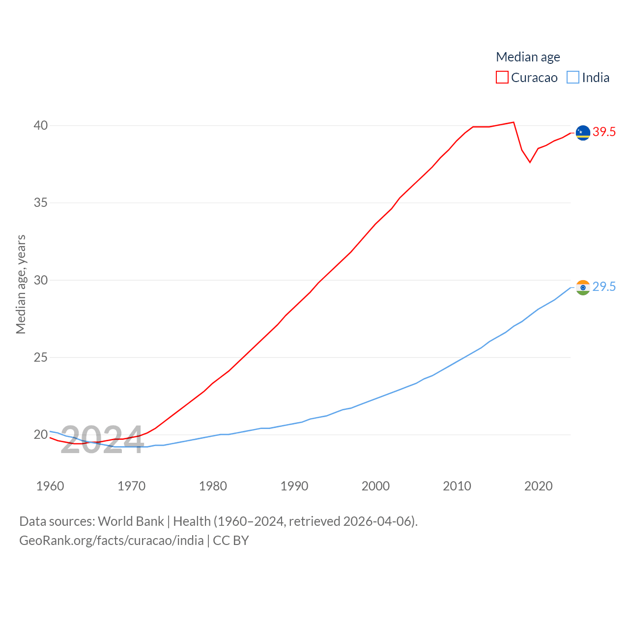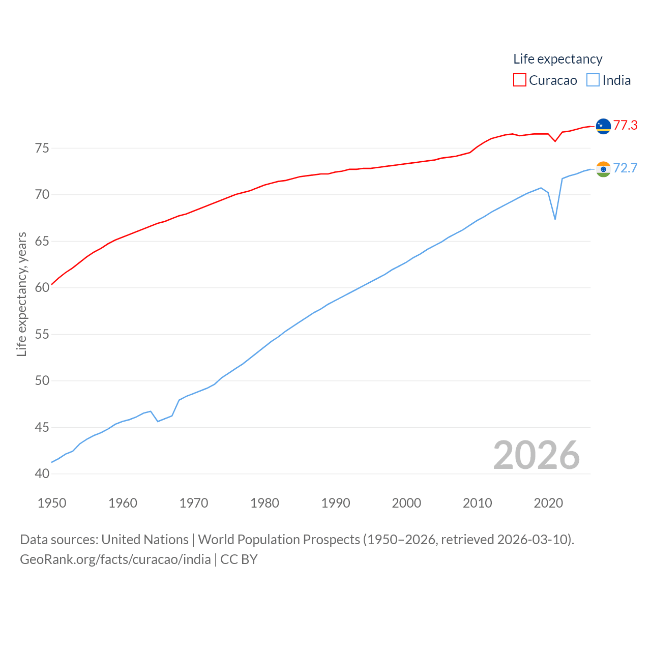 Curacao has a population of 156K (ranked 179/197), compared with 1.45B in India (ranked 1/197). Curacao's land area is 171.4 sq mi versus 1,147,955 sq mi for India (ranked 182nd vs. 7th).