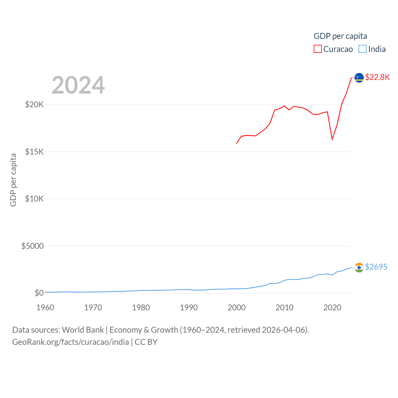 By GDP, Curacao ranks 167/197 ($3.56B) and India ranks 5/197 ($3.91T). By GDP per capita, Curacao ranks 56/197 ($22,833), while India ranks 143/197 ($2,695).