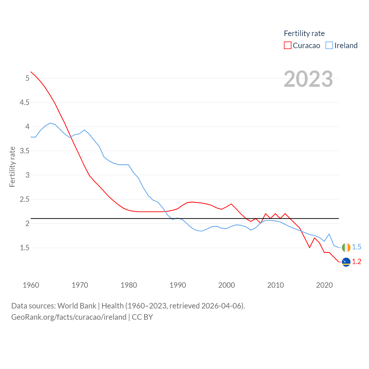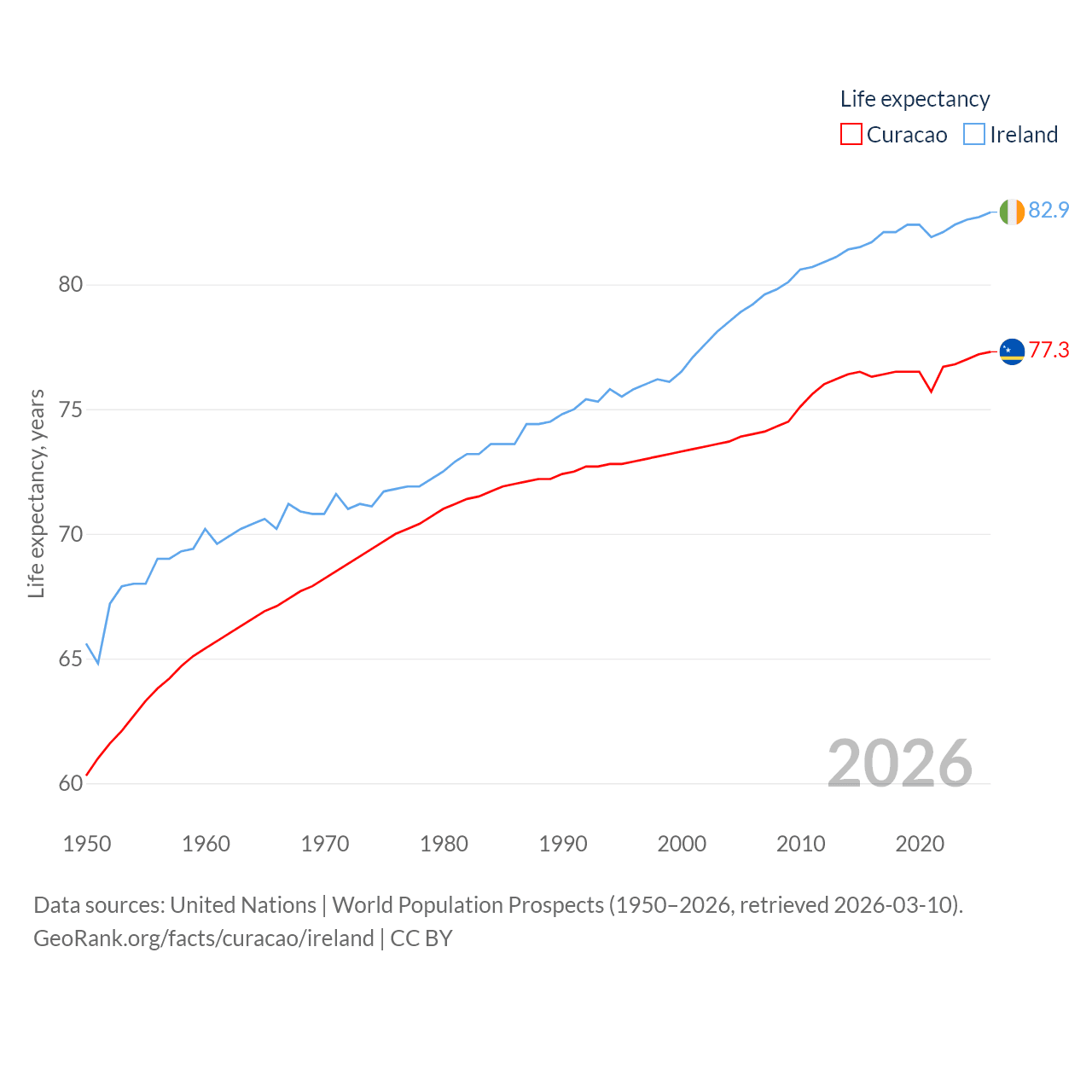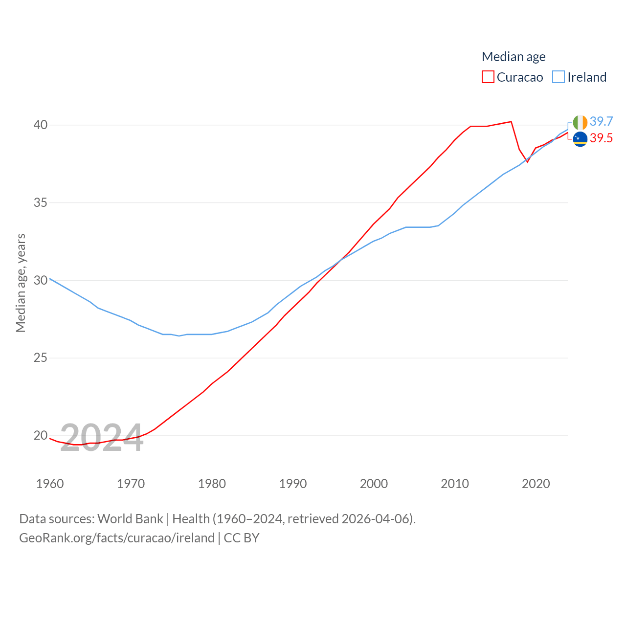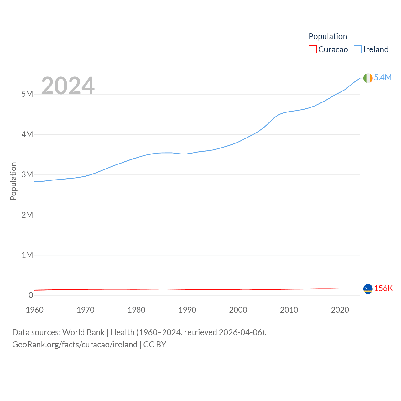 Curacao has a population of 156K (ranked 179/197), compared with 5.4M in Ireland (ranked 120/197). Curacao's land area is 171.4 sq mi versus 26,599 sq mi for Ireland (ranked 182nd vs. 119th).