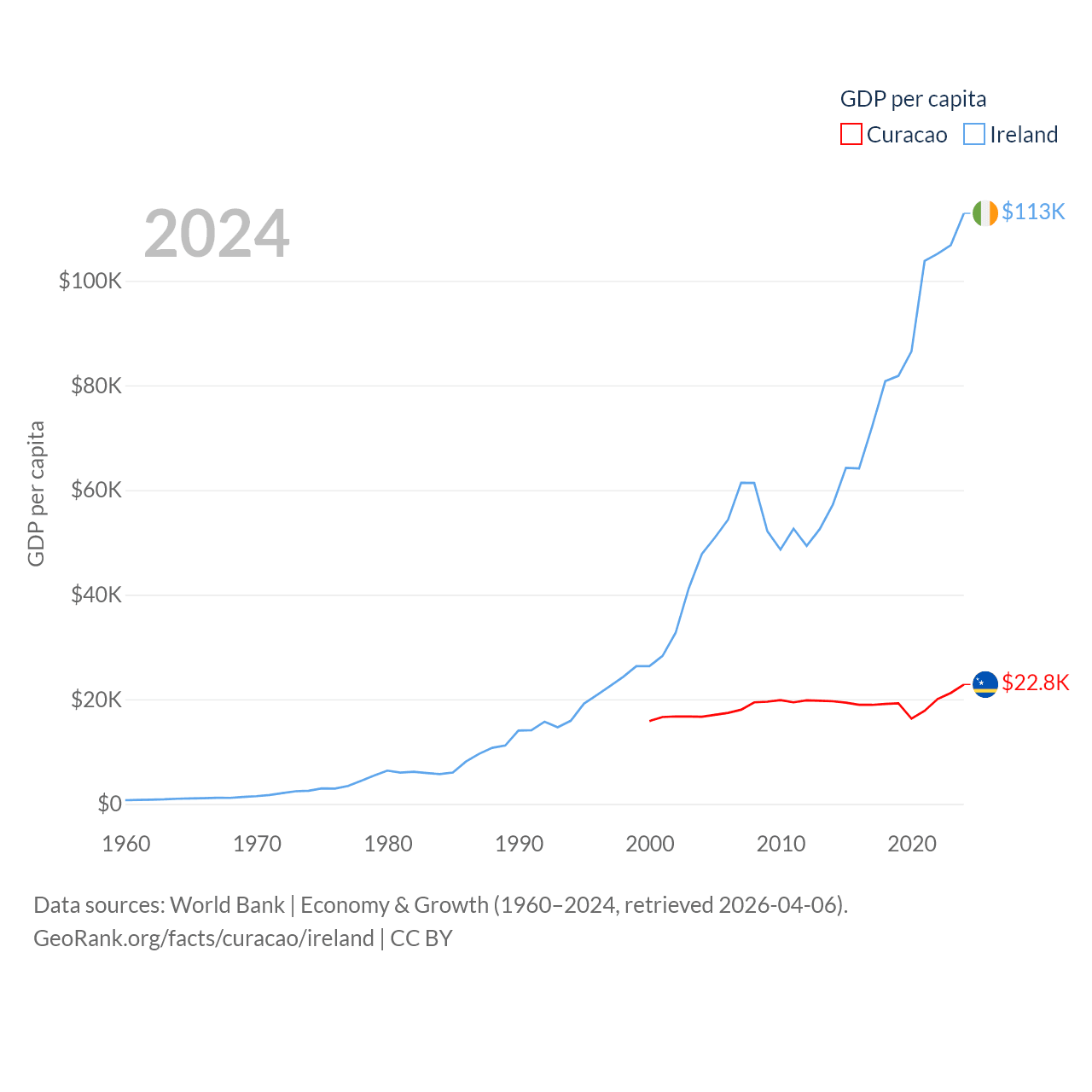 By GDP, Curacao ranks 167/197 ($3.56B) and Ireland ranks 25/197 ($609B). By GDP per capita, Curacao ranks 56/197 ($22,833), while Ireland ranks 4/197 ($112,895).