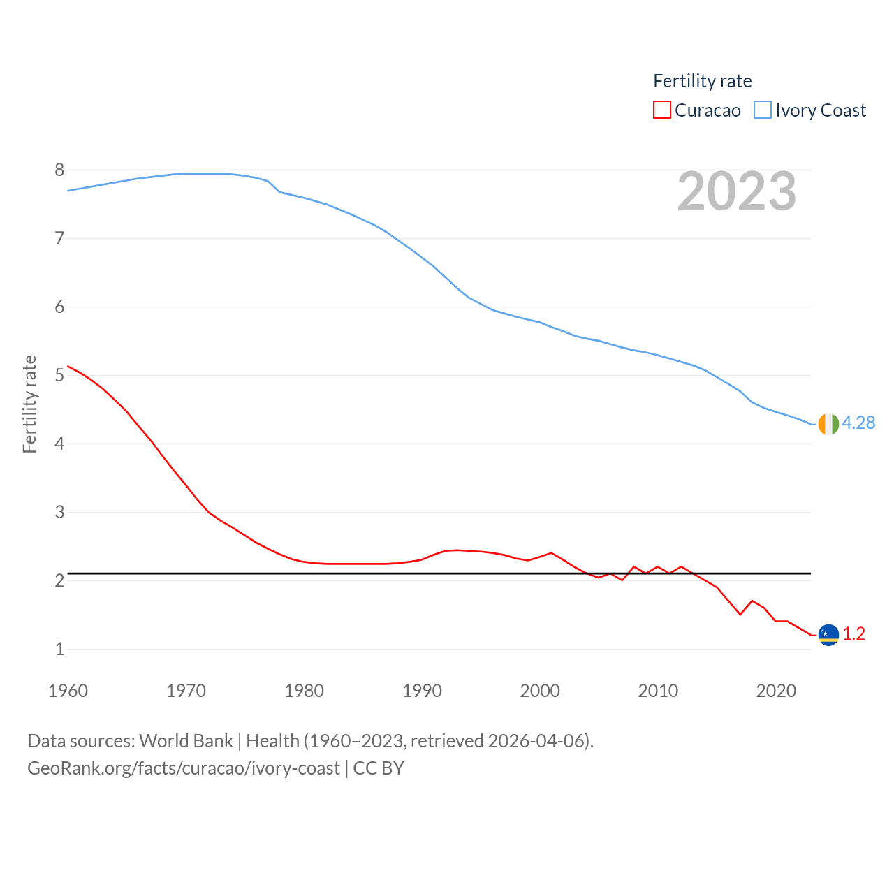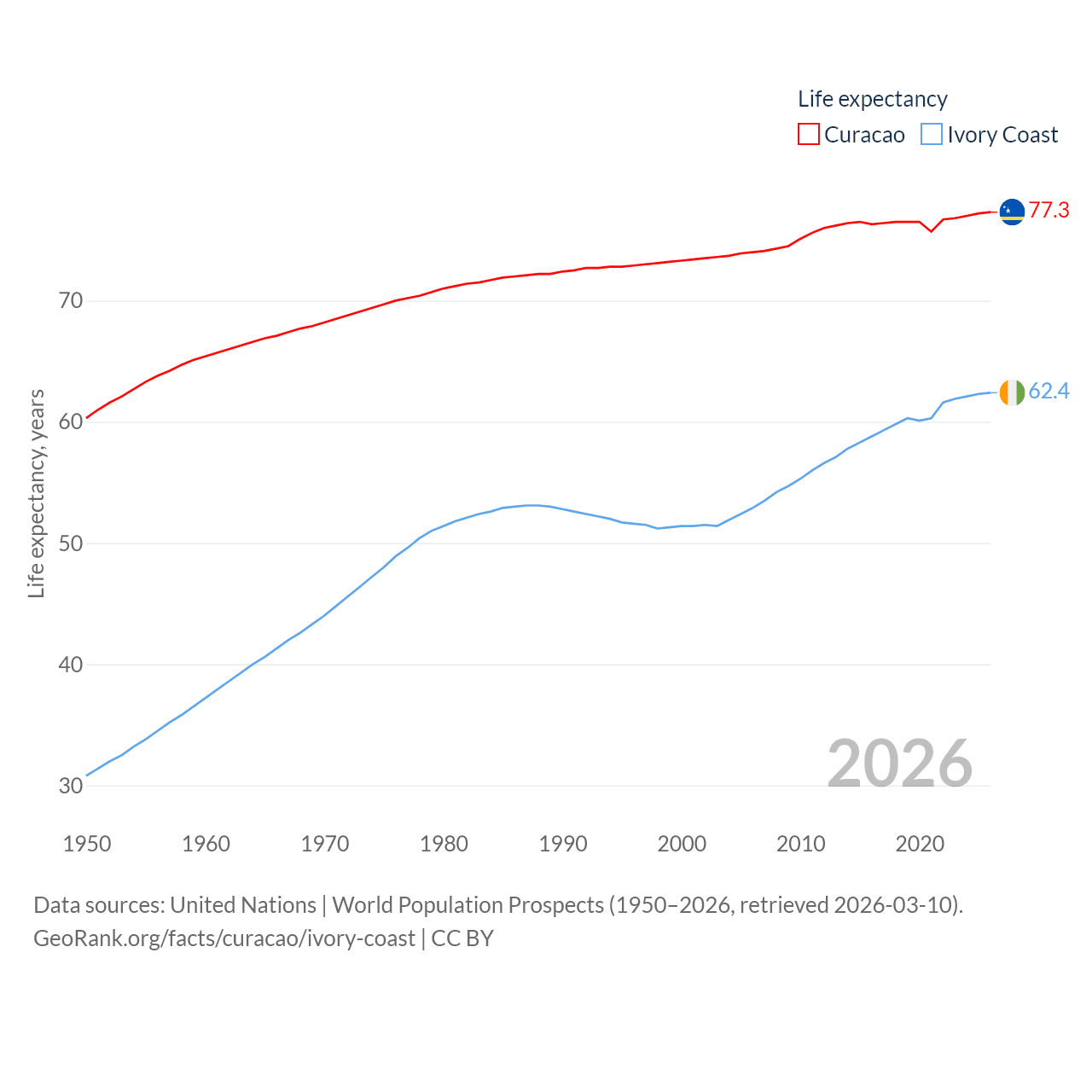 Curacao has a population of 156K (ranked 179/197), compared with 31.9M in Ivory Coast (ranked 50/197). Curacao's land area is 171.4 sq mi versus 122,780 sq mi for Ivory Coast (ranked 182nd vs. 66th).
