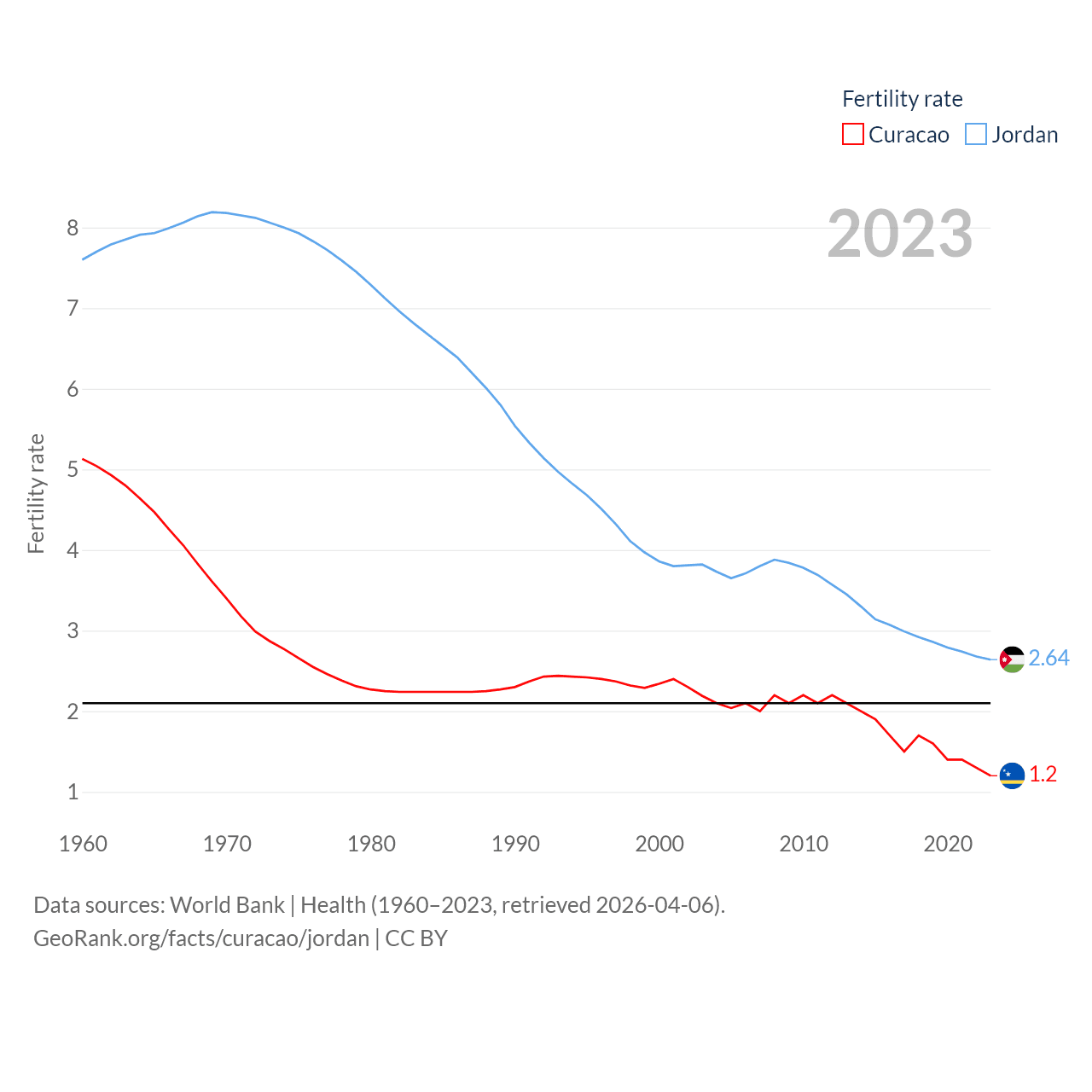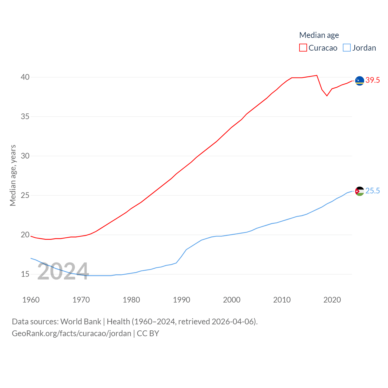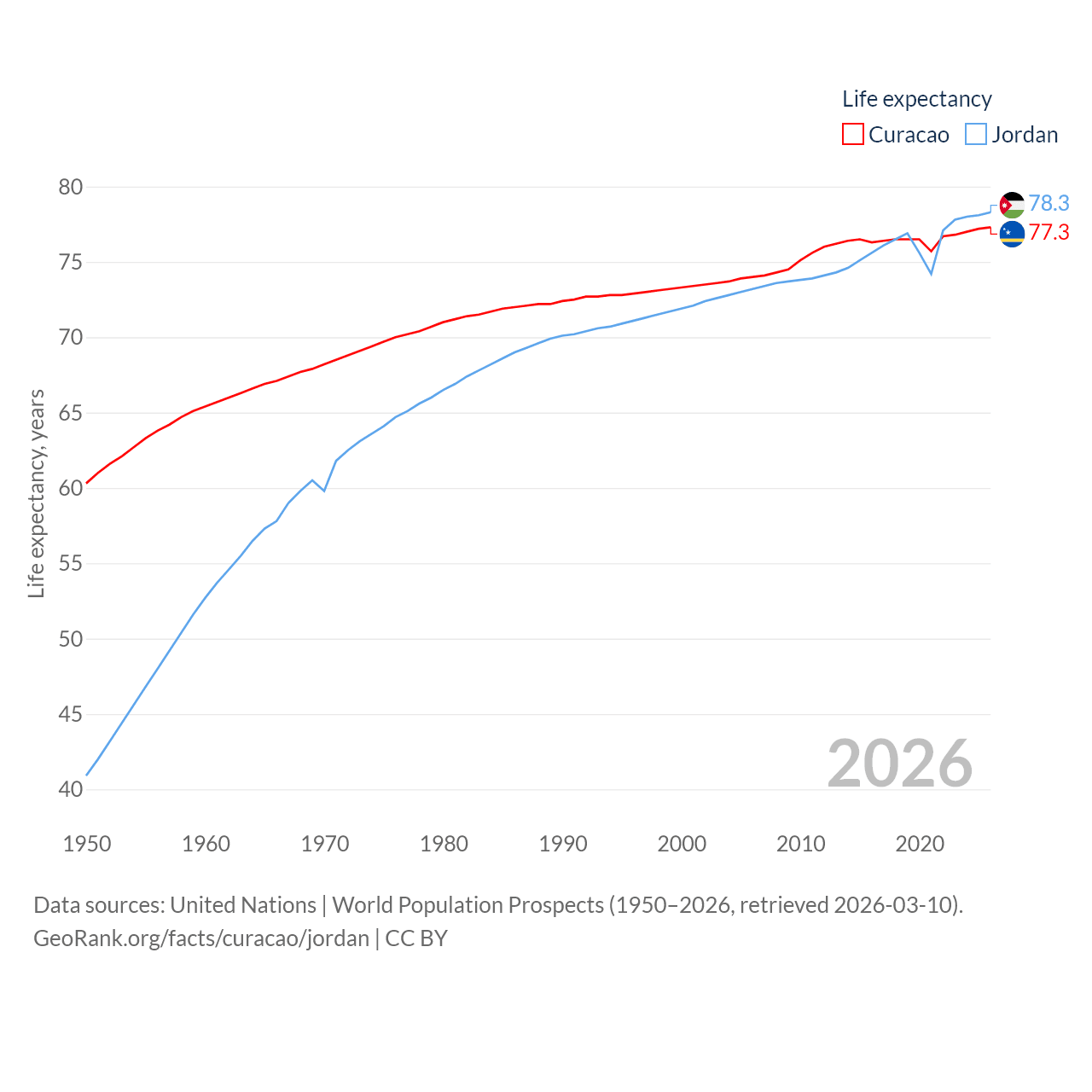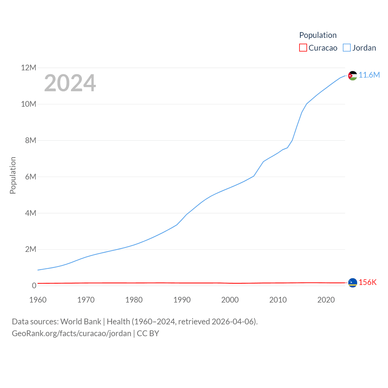 Curacao has a population of 156K (ranked 179/197), compared with 11.6M in Jordan (ranked 84/197). Curacao's land area is 171.4 sq mi versus 34,284 sq mi for Jordan (ranked 182nd vs. 110th).