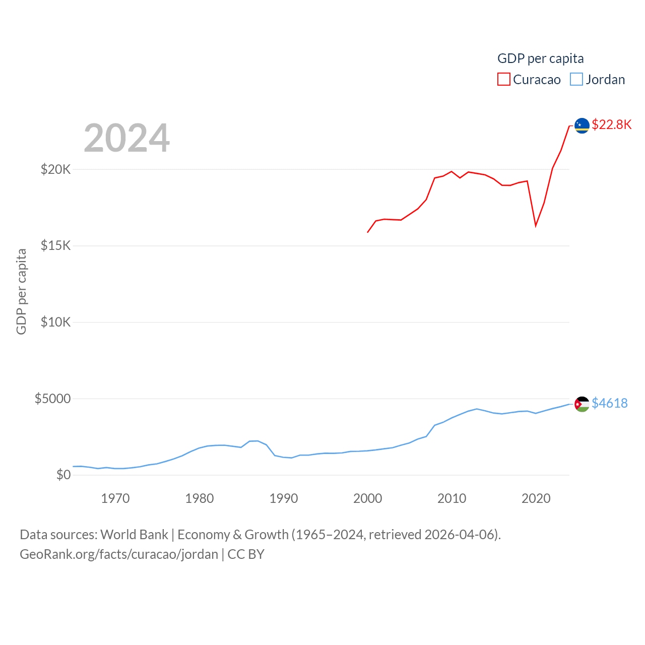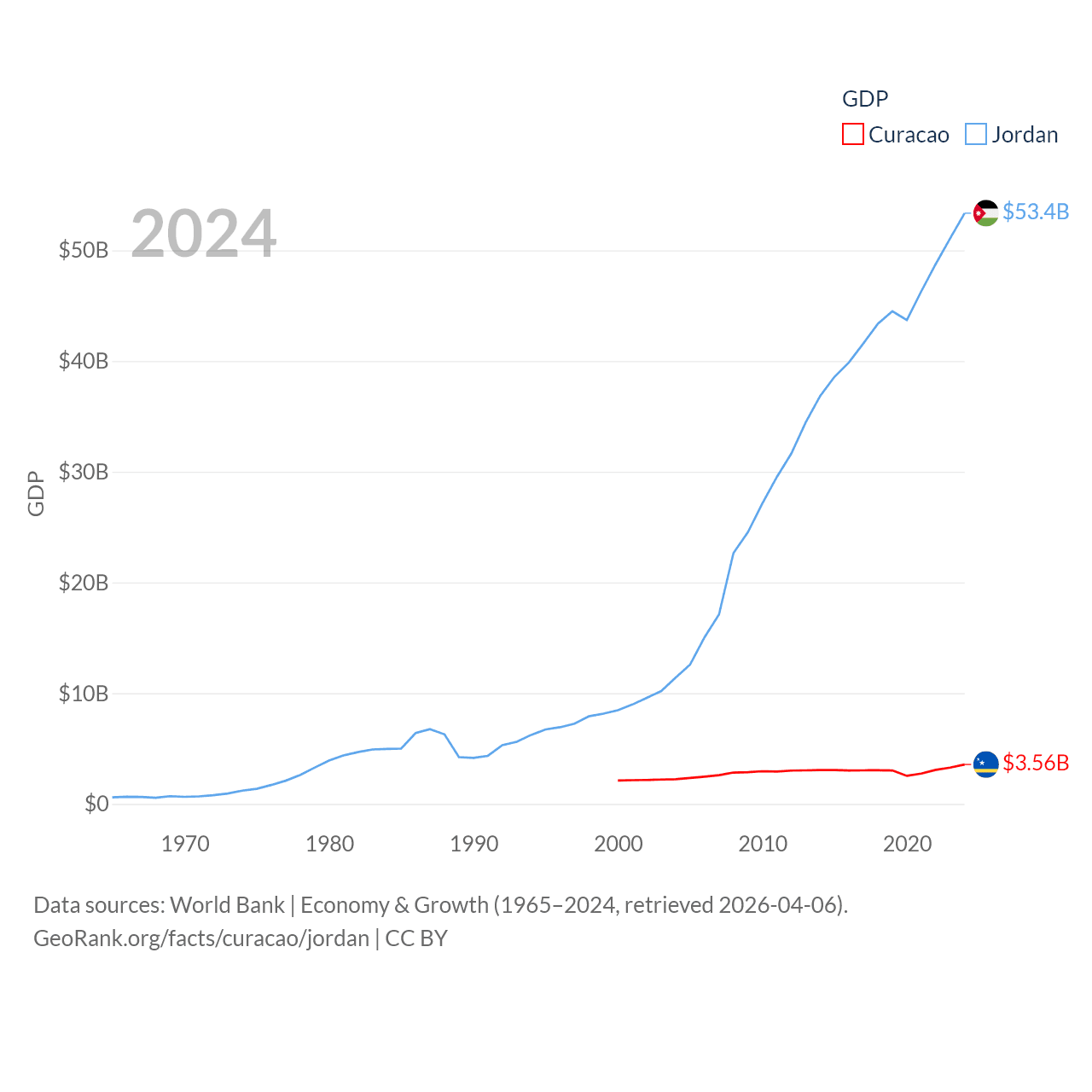 By GDP, Curacao ranks 167/197 ($3.56B) and Jordan ranks 90/197 ($53.4B). By GDP per capita, Curacao ranks 56/197 ($22,833), while Jordan ranks 123/197 ($4,618).