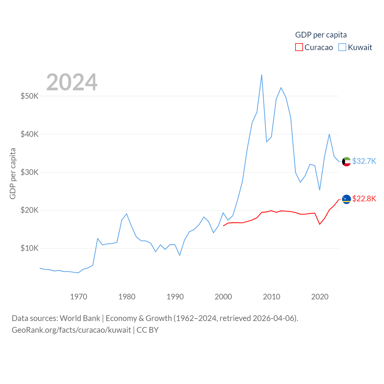 By GDP, Curacao ranks 167/197 ($3.56B) and Kuwait ranks 59/197 ($160B). By GDP per capita, Curacao ranks 56/197 ($22,833), while Kuwait ranks 37/197 ($32,718).