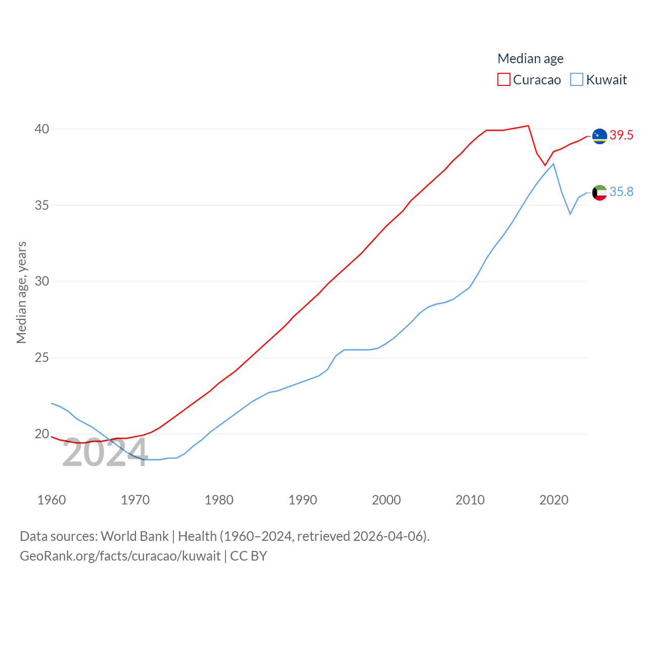 Curacao has a population of 156K (ranked 179/197), compared with 4.9M in Kuwait (ranked 127/197). Curacao's land area is 171.4 sq mi versus 6,880 sq mi for Kuwait (ranked 182nd vs. 153rd).