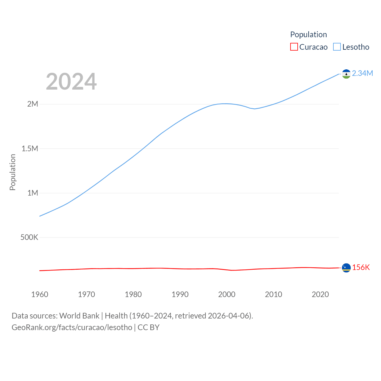 Curacao has a population of 156K (ranked 179/197), compared with 2.34M in Lesotho (ranked 145/197). Curacao's land area is 171.4 sq mi versus 11,722 sq mi for Lesotho (ranked 182nd vs. 137th).