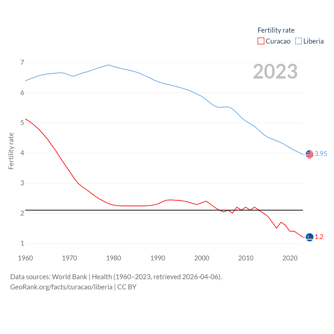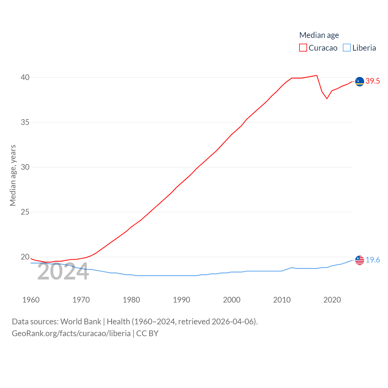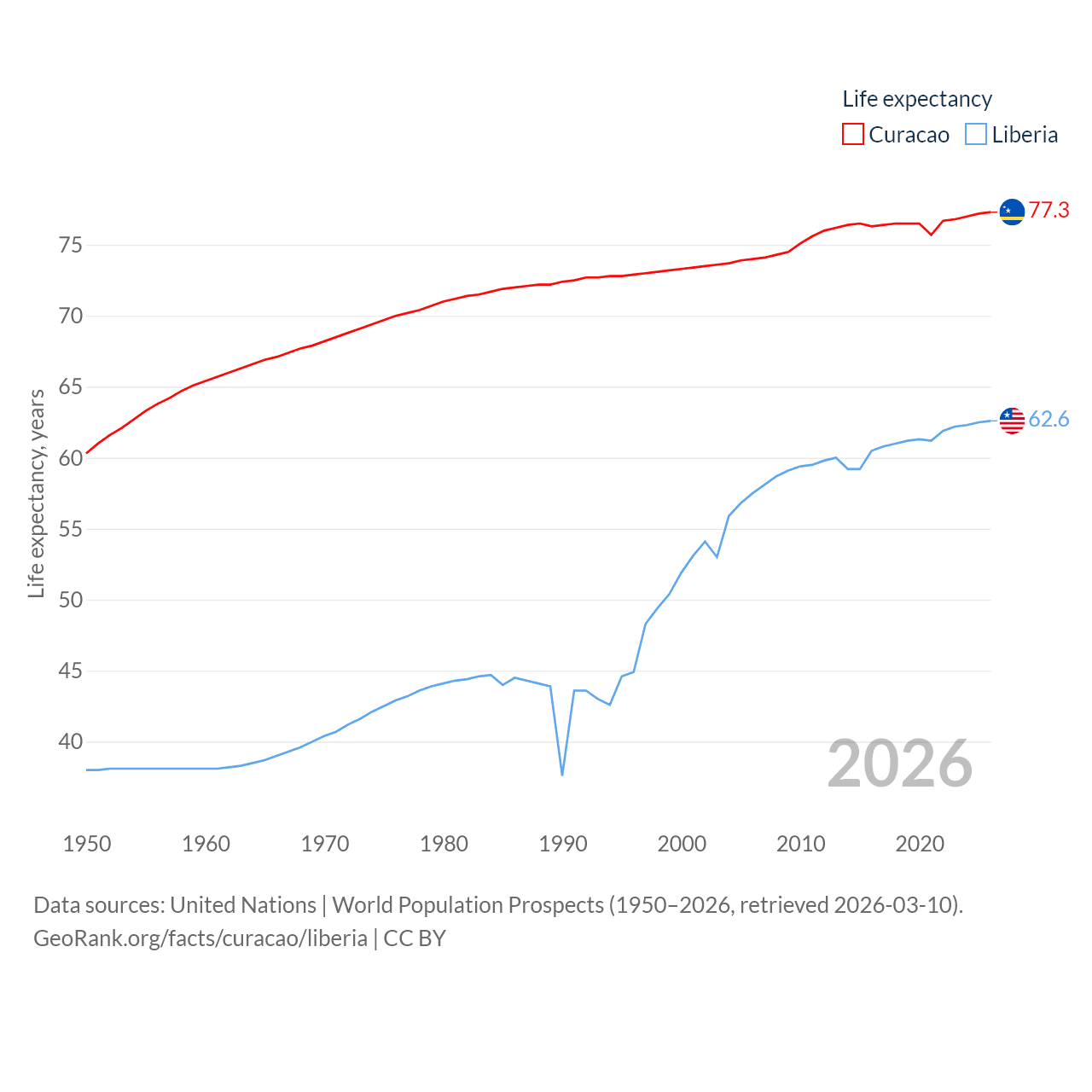 Curacao has a population of 156K (ranked 179/197), compared with 5.61M in Liberia (ranked 117/197). Curacao's land area is 171.4 sq mi versus 37,189 sq mi for Liberia (ranked 182nd vs. 106th).