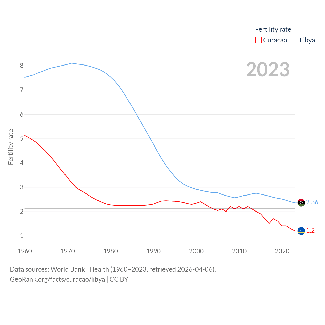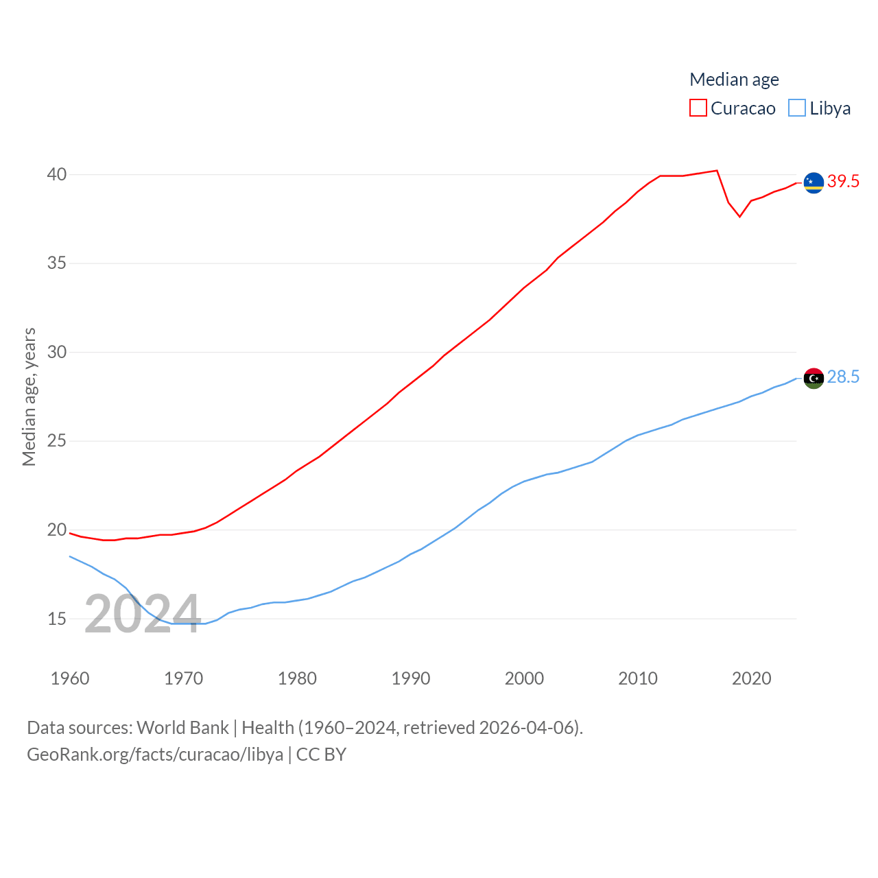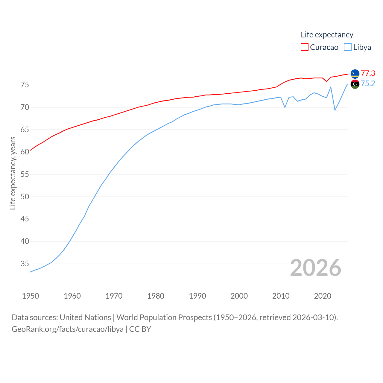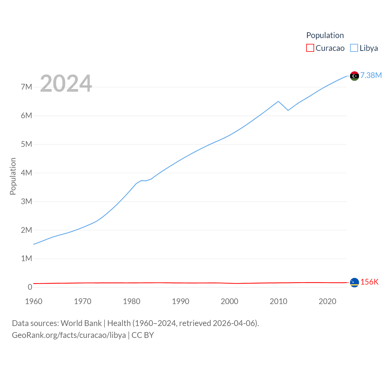 Curacao has a population of 156K (ranked 179/197), compared with 7.38M in Libya (ranked 105/197). Curacao's land area is 171.4 sq mi versus 679,362 sq mi for Libya (ranked 182nd vs. 16th).
