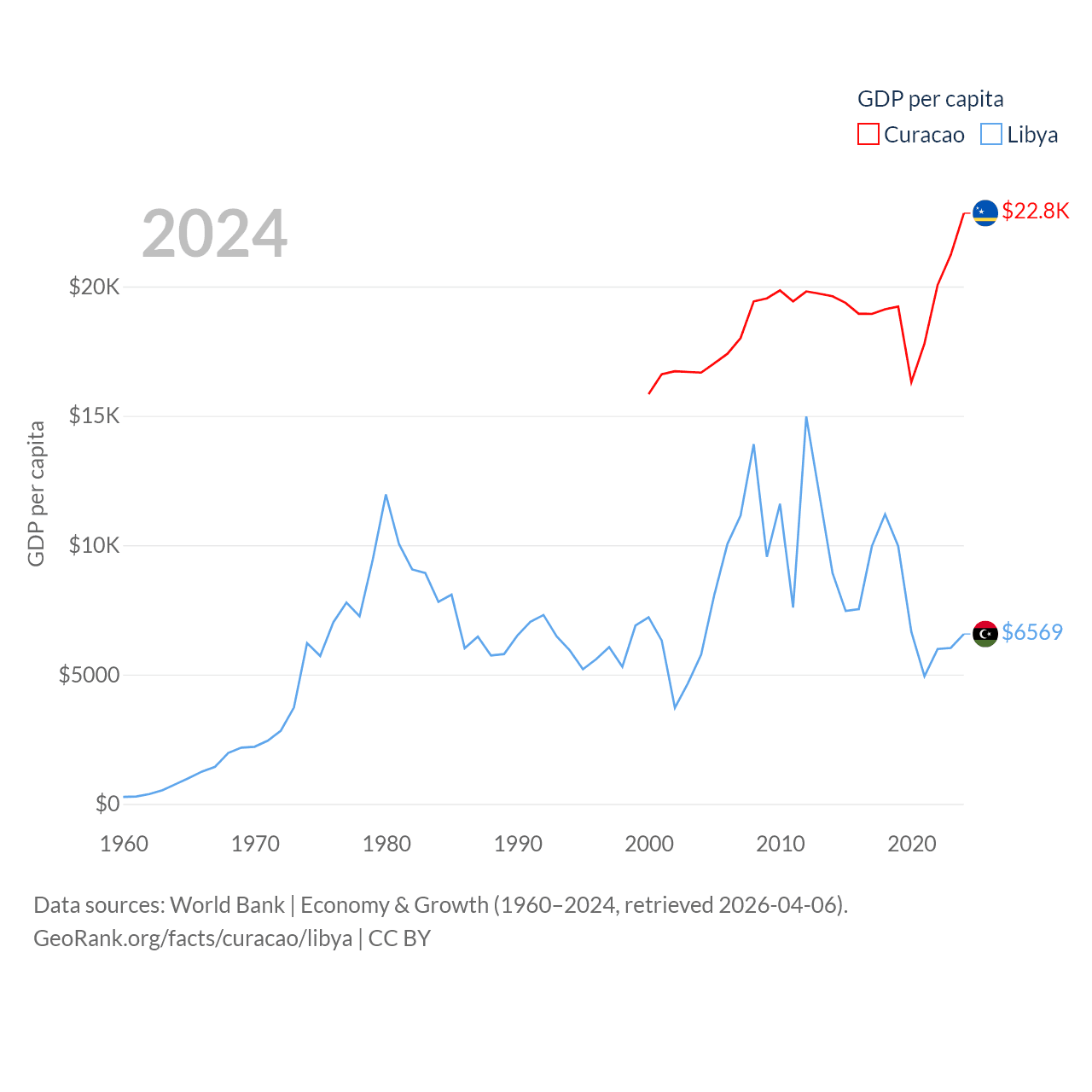 By GDP, Curacao ranks 167/197 ($3.56B) and Libya ranks 95/197 ($48.5B). By GDP per capita, Curacao ranks 56/197 ($22,833), while Libya ranks 107/197 ($6,569).