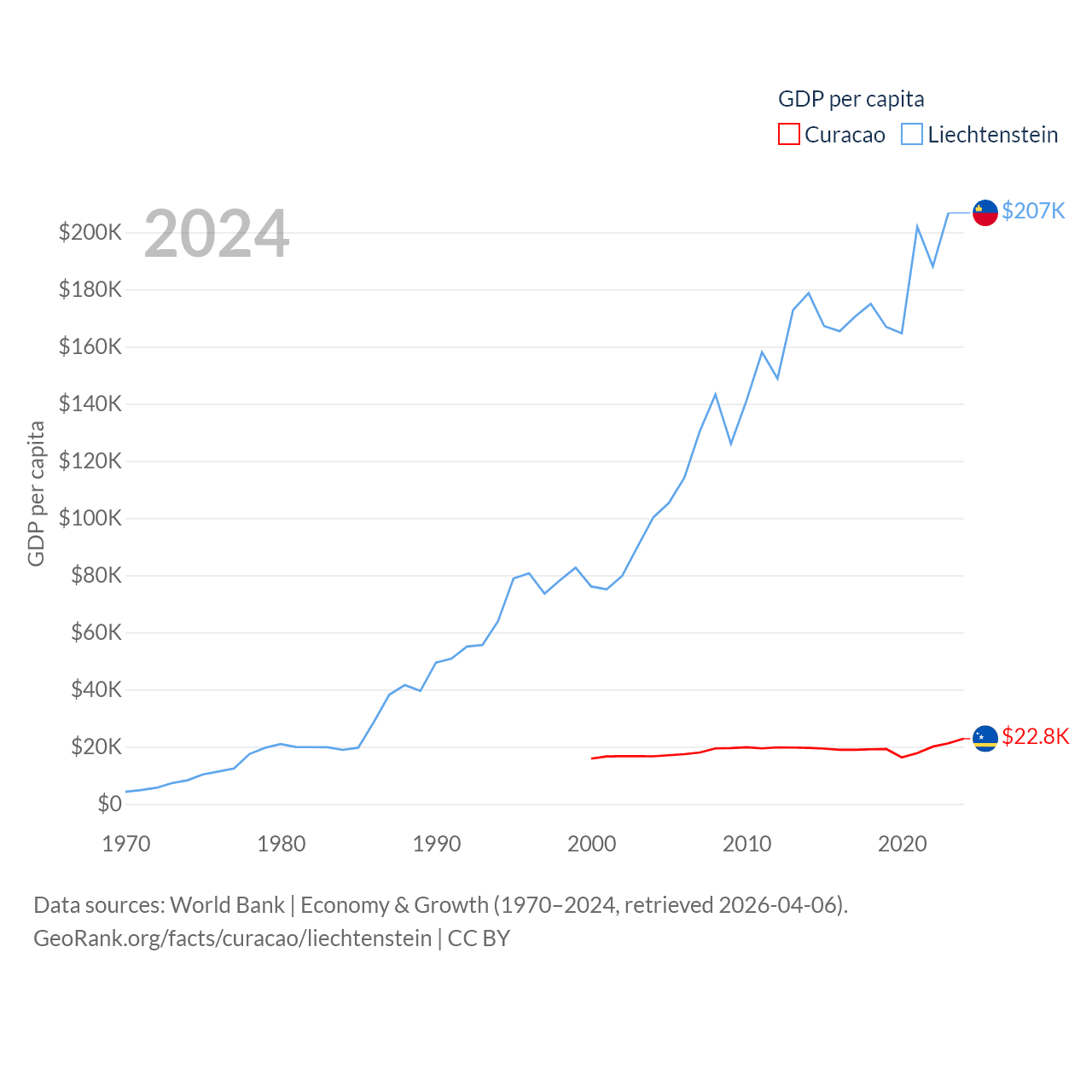 By GDP, Curacao ranks 167/197 ($3.56B) and Liechtenstein ranks 156/197 ($8.24B). By GDP per capita, Curacao ranks 56/197 ($22,833), while Liechtenstein ranks 2/197 ($206,781).